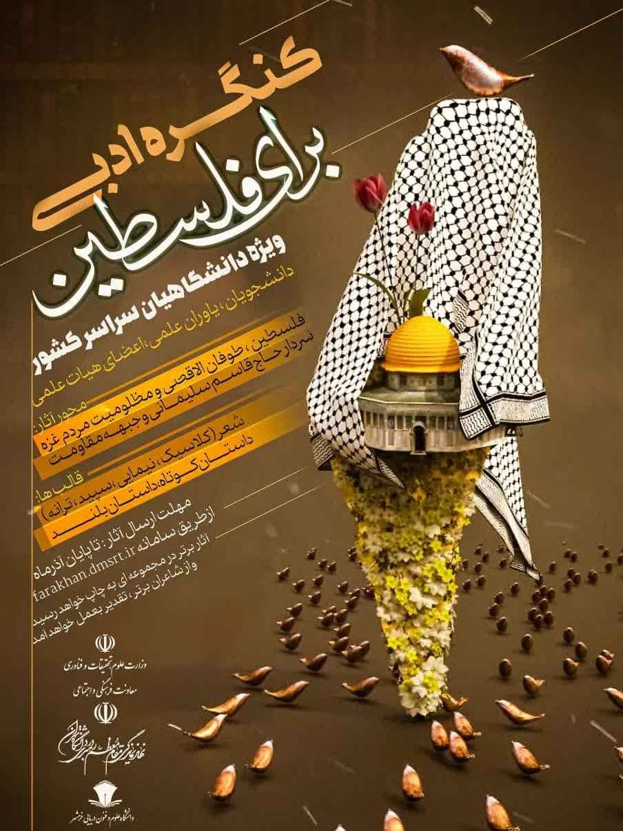 449 کنگره ادبی برای فلسطین ویژه دانشگاهیان سراسر کشور این کنگره ویژه دانشجویان، یاوران علمی و اعضای هیات علمی دانشگاه ها و موسسات آموزشی سراسر کشور میباشد. مهلت ارسال آثار تا پایان دی ماه 1402...