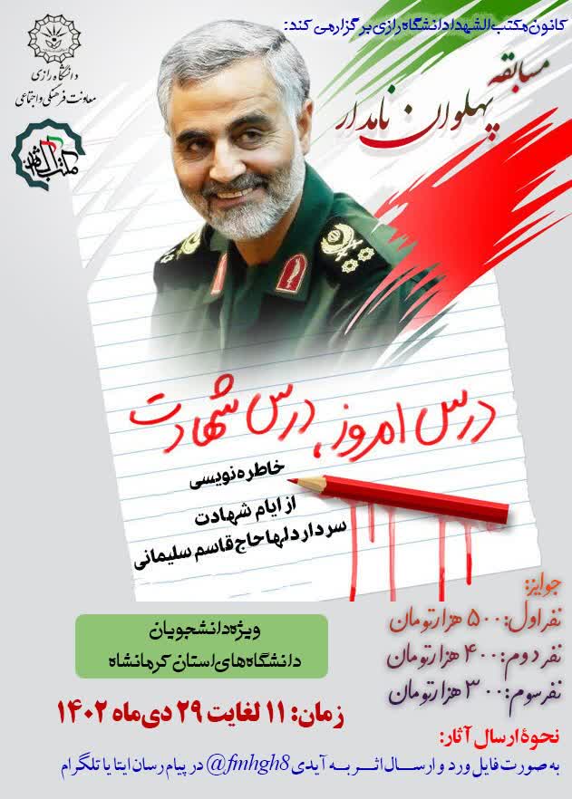 827 مسابقه دانشجویی "پهلوان نامدار" کانون مکتب الشهدا دانشگاه رازی برگزار میکند: مسابقه "پهلوان نامدار" ویژه دانشجویان دانشگاههای استان کرمانشاه خاطره نویسی از ایام شهادت سپهبد حاج...