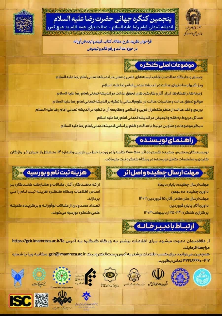 فراخوان پنجمین کنگره جهانی حضرت رضا (ع) با شعار محوری عدالت برای همه، ظلم به هیچ کس منتشر شد.