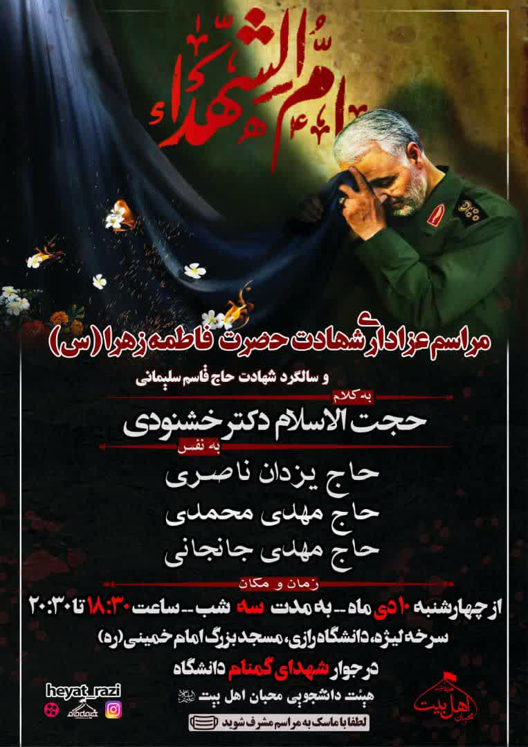 هیئت دانشجویی محبان اهل بیت(ع) دانشگاه رازی به مناسبت فرارسین ایام فاطمیه(س) و سالگرد شهادت سردار حاج قاسم سلیمانی، مراسم عزاداری شهادت حضرت فاطمۀ زهراء(س) و سالگرد شهادت سردار سلیمانی را با رعایت مقررات و پروتکل های بهداشتی به مدت سه شب در مسجد امام خمینی(ره) دانشگاه رازی برگزار می کند.
