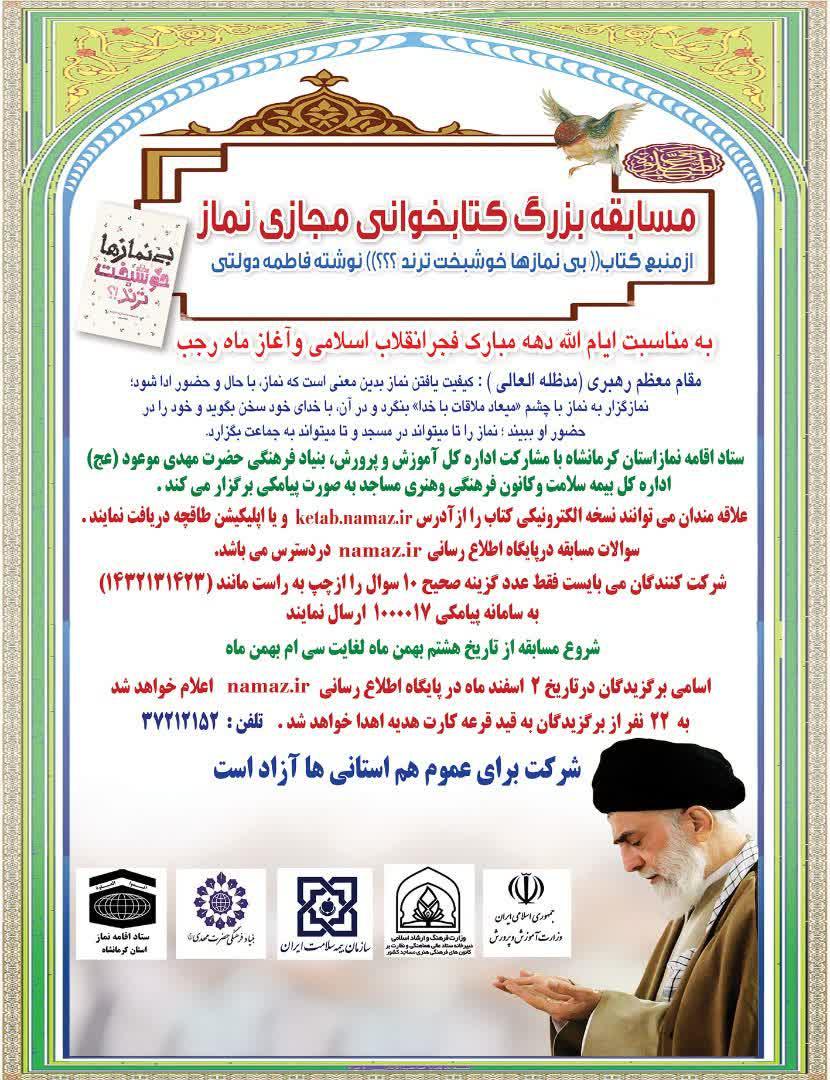 ستاد اقامه نماز استان کرمانشاه، به منظور گسترش و تعمیق فرهنگ نورانی نماز و ترویج این فریضه الهی، ستاد اقامه نماز استان به مناسبت فرا رسیدن ایام الله دهه مبارک فجر انقلاب اسلامی و آغاز ماه مبارک رجب المرجب با مشارکت اداره کل آموزش و پرورش، بنیاد فرهنگی حضرت مهدی موعود (عج)، اداره کل بیمه سلامت و کانون فرهنگی و هنری مساجد استان مسابقه بزرگ کتابخوانی مجازی نماز برگزار می کند.
