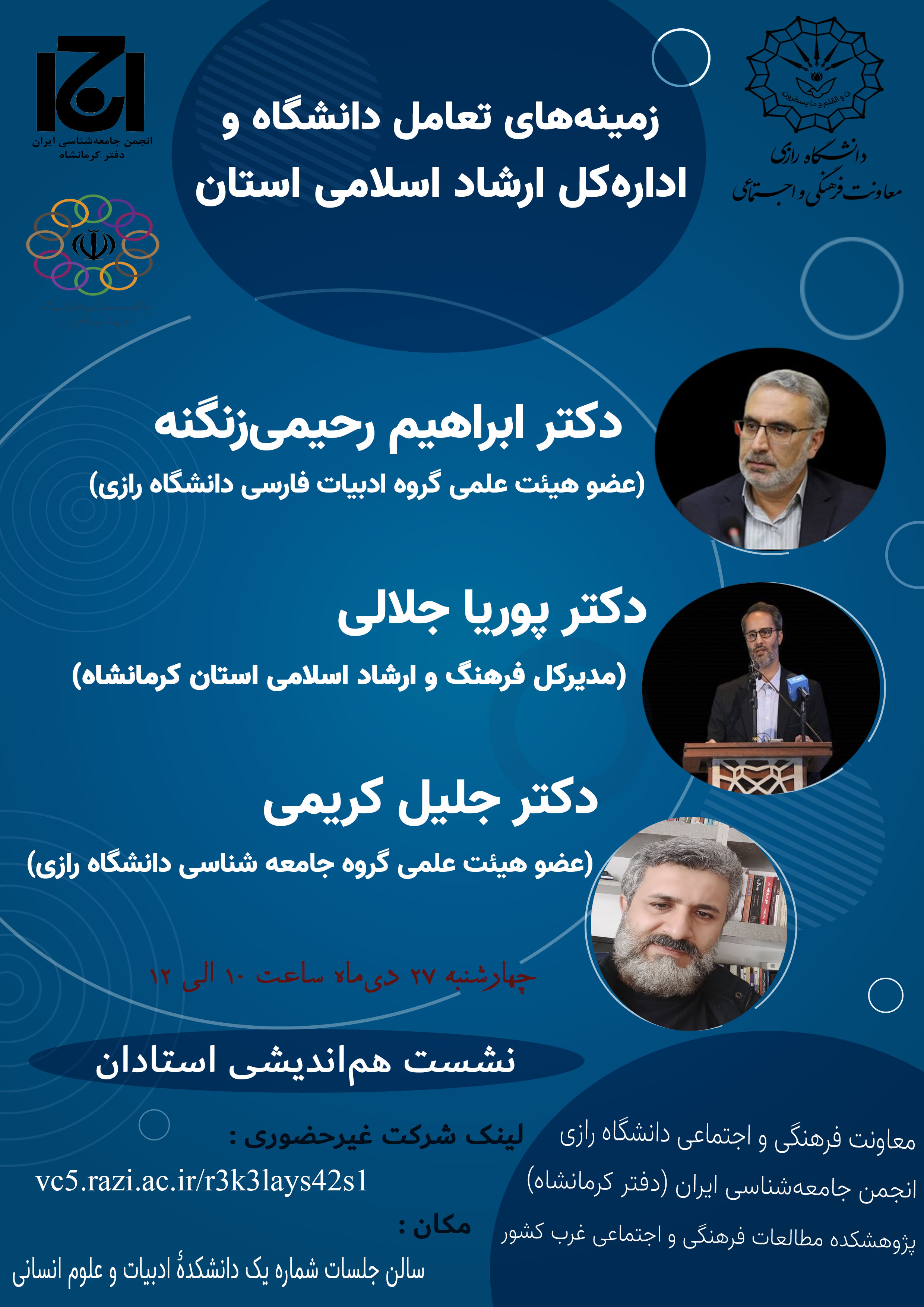 برگزارکننده: معاونت فرهنگی و اجتماعی دانشگاه رازی، انجمن جامعهشناسی ایرانی (دفتر کرمانشاه) و پژوهشکده مطالعات فرهنگی و اجتماعی غرب کشور
