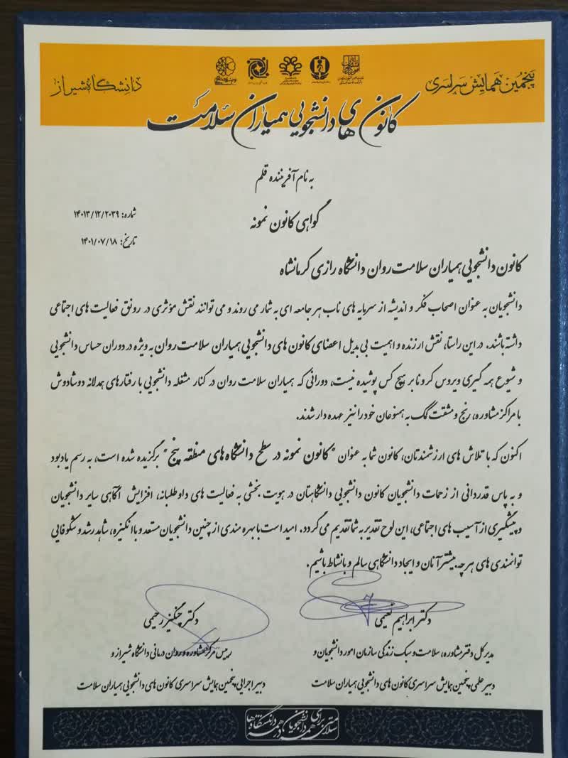 کسب عنوان کانون نمونه همیاران سلامت روان دانشگاه رازی در سطح دانشگاههای منطقه 5 کشور