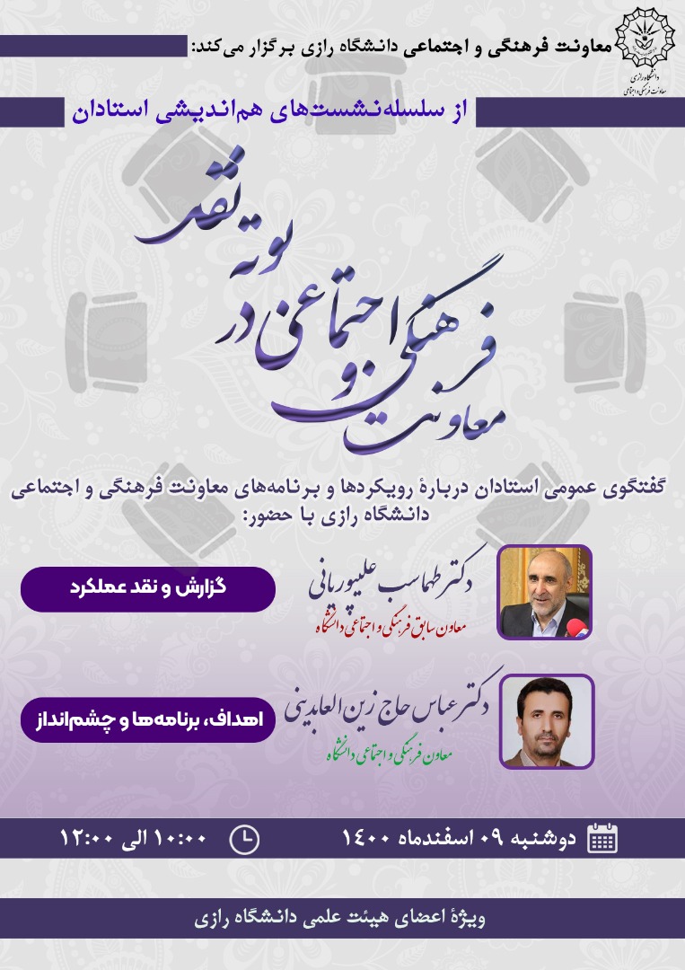 گفتگوی عمومی استادان دانشگاه رازی دربارۀ رویکردها و برنامههای معاونت فرهنگی و اجتماعی دانشگاه - معاونت فرهنگی