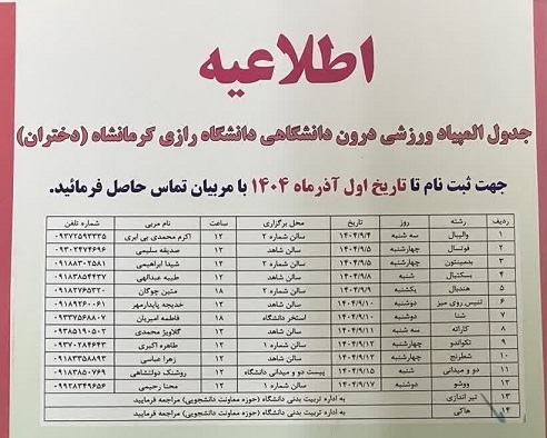 ثبت‌نام: دانشجویان علاقه‌مند می‌توانند تا تاریخ اول آذرماه ۱۴۰۴ با مربیان مربوطه جهت ثبت‌نام در رشته‌های مختلف ورزشی تماس حاصل نمایند.