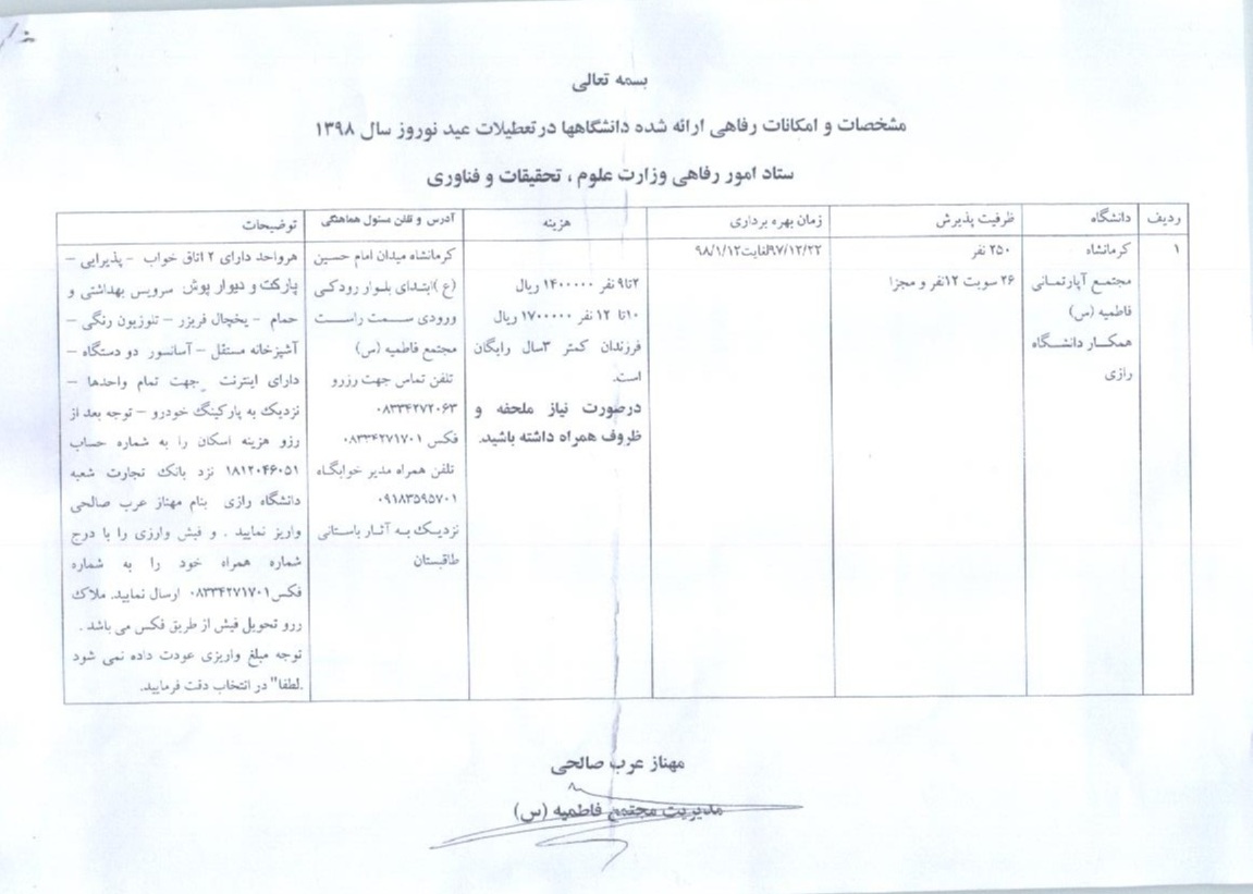بدینوسیله مشخصات امکانات رفاهی دانشگاه رازی در نوروز ۱۳۹۸ جهت استفاده اعضاء محترم هیات علمی و کارکنان شریف دانشگاهها در سراسر کشور اعلام می گردد : مجتمع خوابگاهی فاطمیه دارای ۲۶ واحد آپارتمان دوخوابه مجهز به دو دستگاه آسانسور با ظرفیت نسبی ۲۵۰ نفر آماده ارائه خدمات رفاهی در نوروز ۹۸ می باشد.