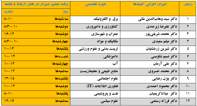 لیست اسامی دبیران ۱۲ کمیته اجرایی و ساعات حضور ایشان در دفتر ارتباط با جامعه دانشگاه واقع در ساختمان کتابخانه مرکزی در دفتر کمیته‌ها با هدف ارتباط با همکاران مطابق با جدول ذیل اعلام می‌گردد: