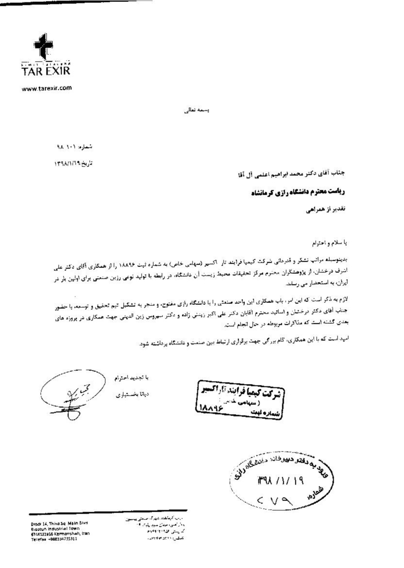 ه گزارش روابط عمومی دانشگاه رازی، شرکت "کیمیا فرایند تار اکسیر" در نامهای از همراهی دانشگاه رازی جهت انجام پروژههای تحقیقاتی قدردانی کرد.