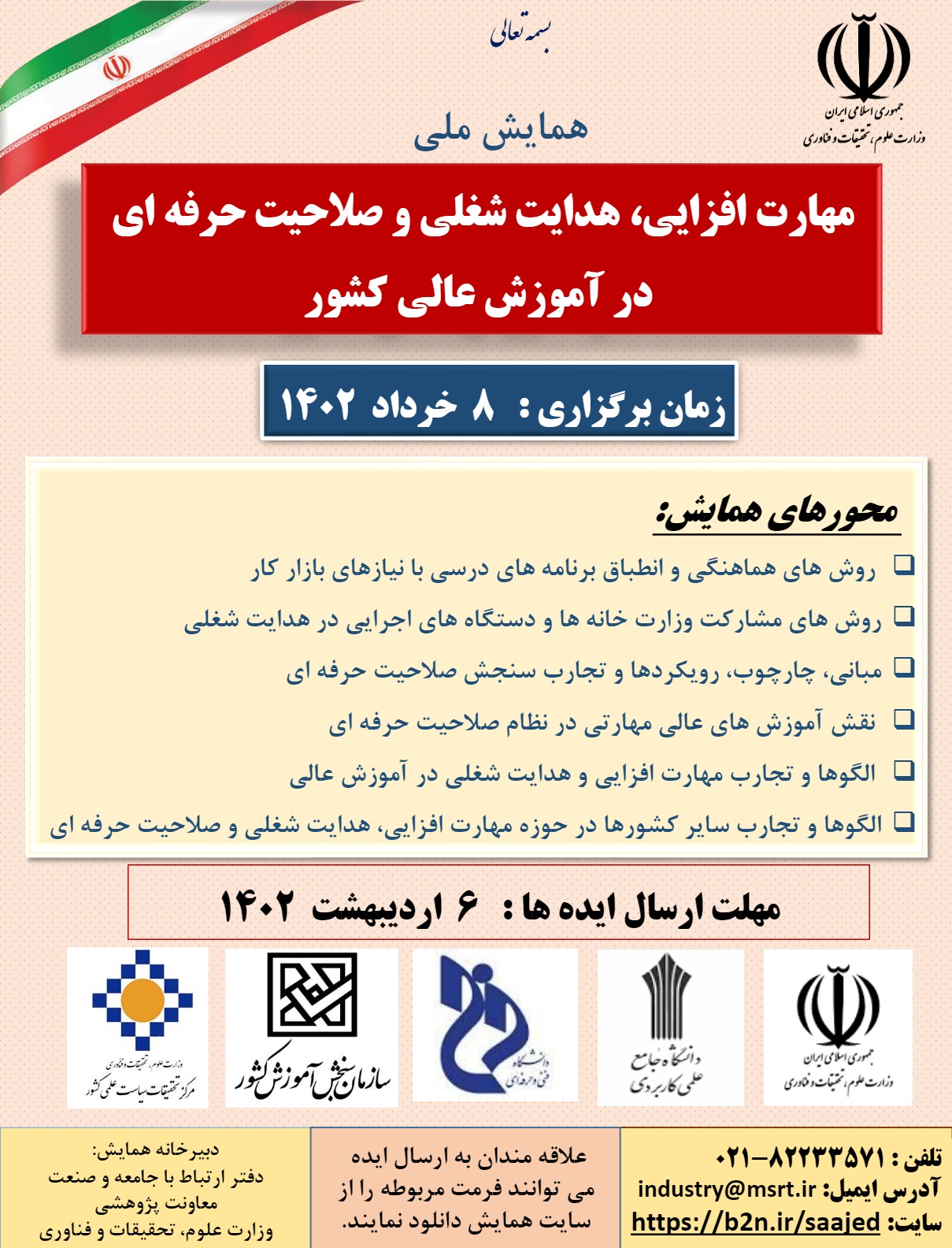 برگزاری همایش ملی "مهارت افزایی، هدایت شغلی و صلاحیت حرفه ای در آموزش عالی" - گروه کارآفرینی و ارتباط با صنعت