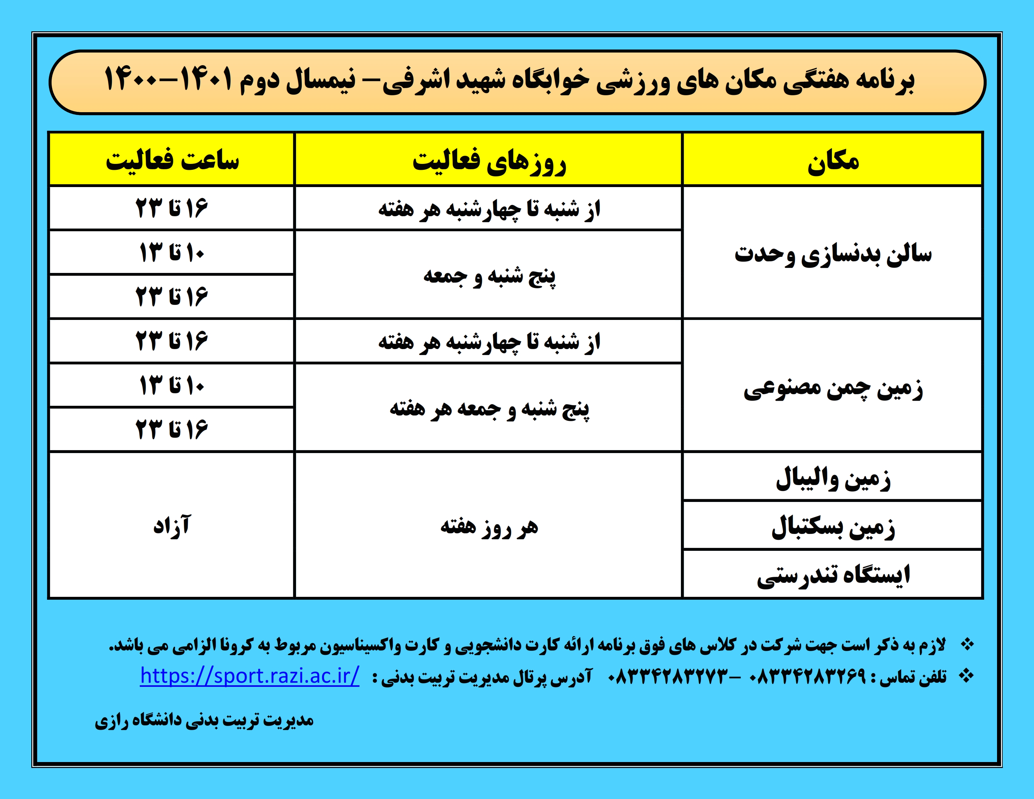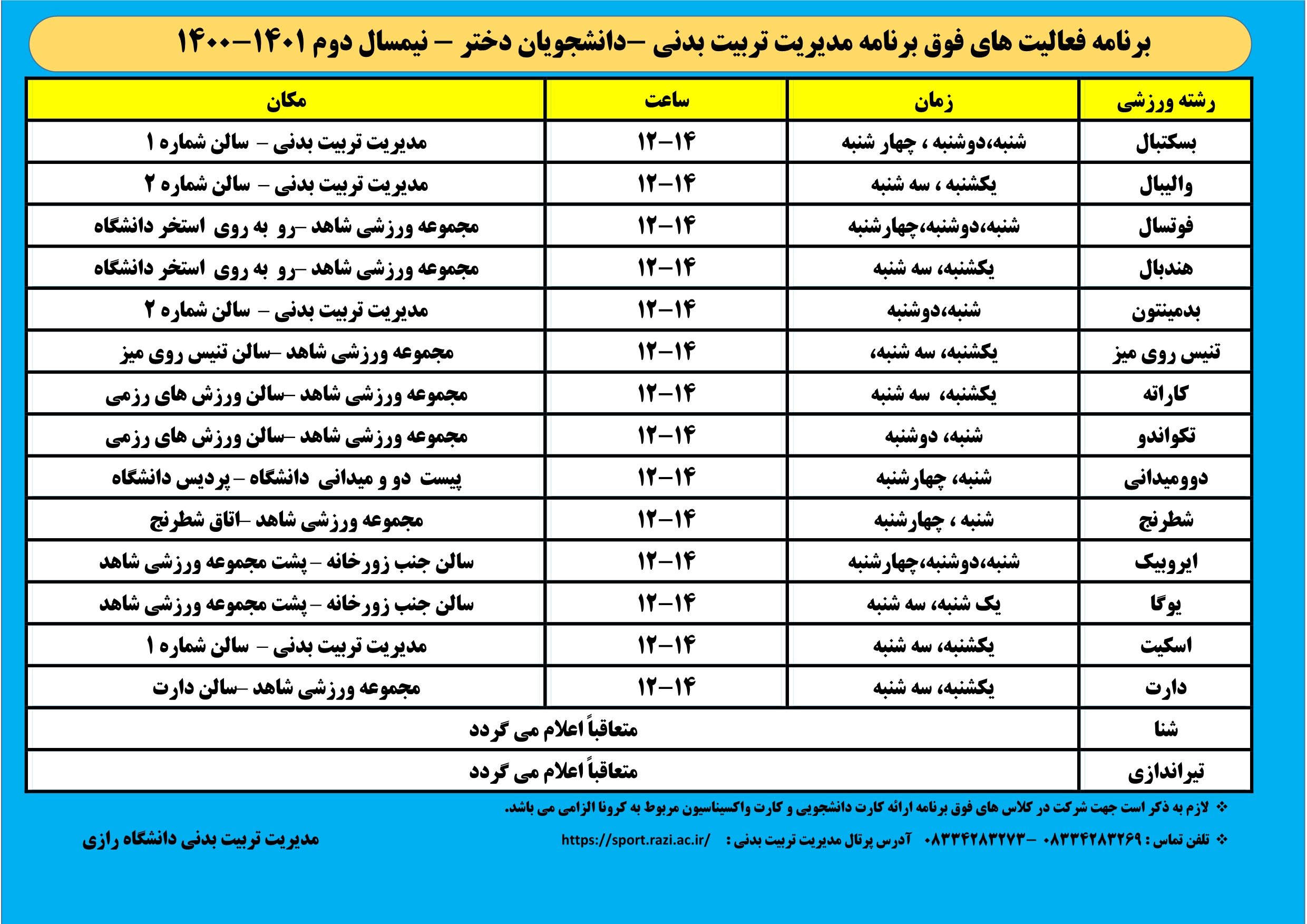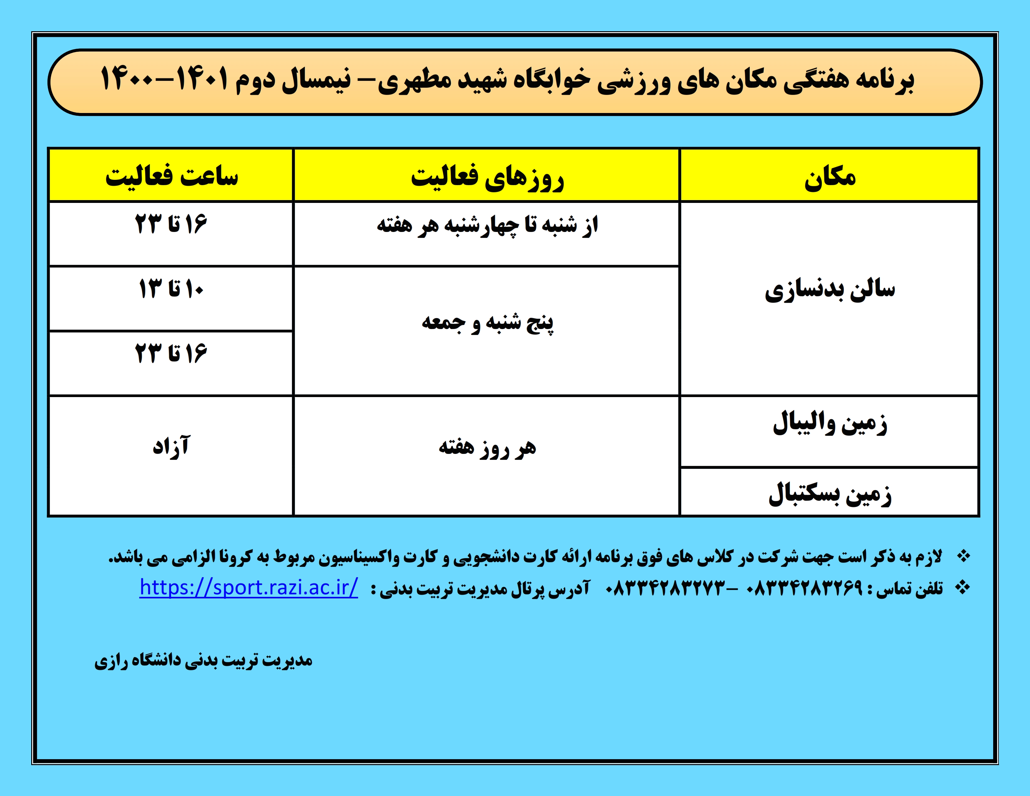 برنامه فعالیت های فوق برنامه دانشجویان دختر و پسر دانشگاه رازی- نیمسال دوم 1401-1400 - مدیریت تربیت بدنی