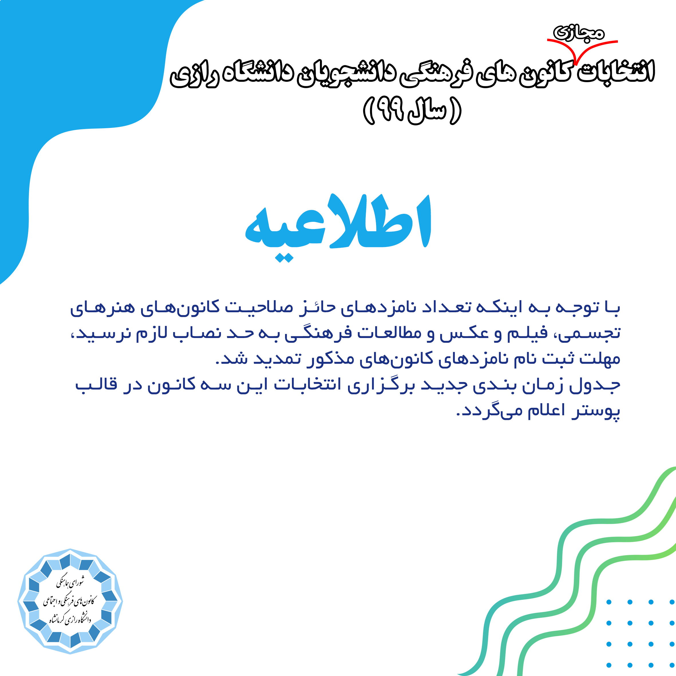 542 اطلاعیۀ انتخابات مجازی کانون های فرهنگی دانشگاه رازی شناسه : 1013576