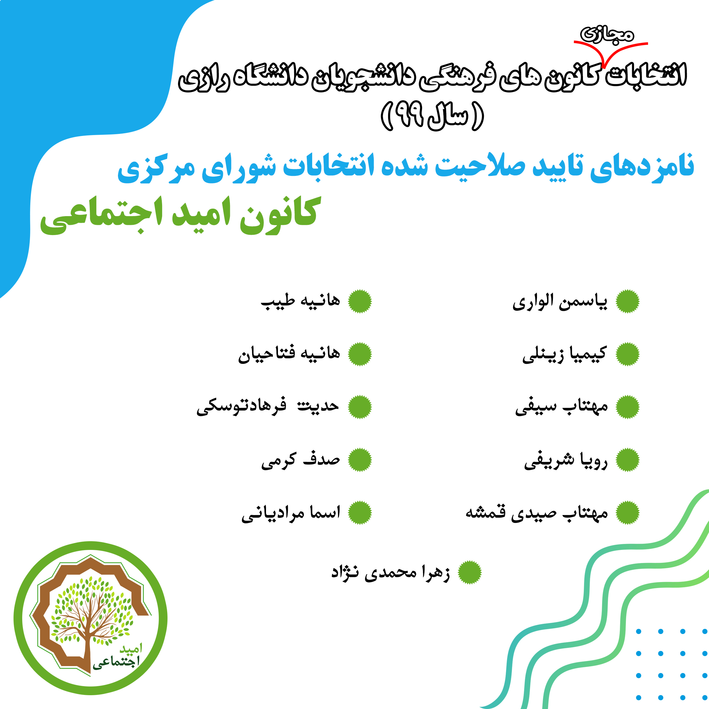 504 اسامی نامزدهای تأیید صلاحیت شدۀ انتخابات شورای مرکزی کانون امید اجتماعی شناسه : 1013592