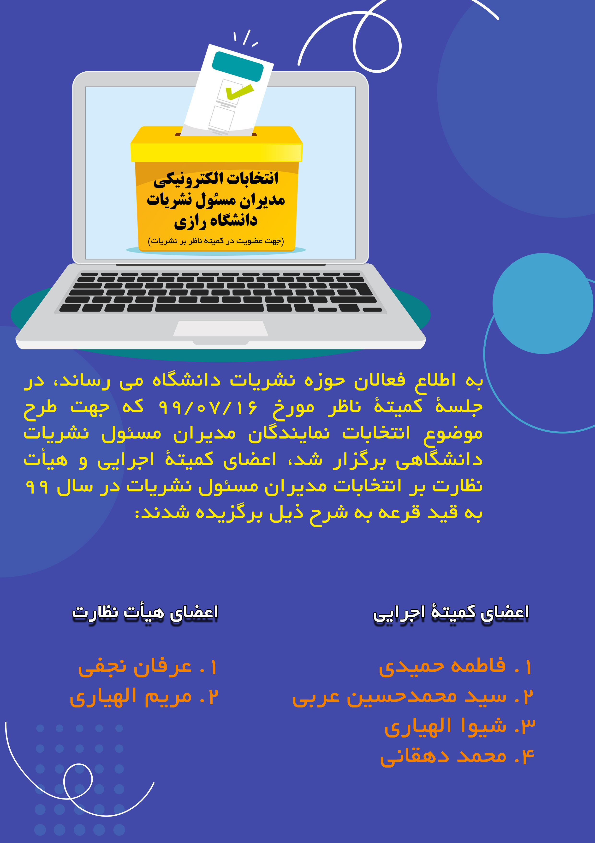899 انتخاب اعضای کمیته اجرایی و هیأت نظارت بر انتخابات نمایندگان مدیران مسئول نشریات دانشگاهی در کمیتۀ ناظر در سال 1399 شناسه : 1013483