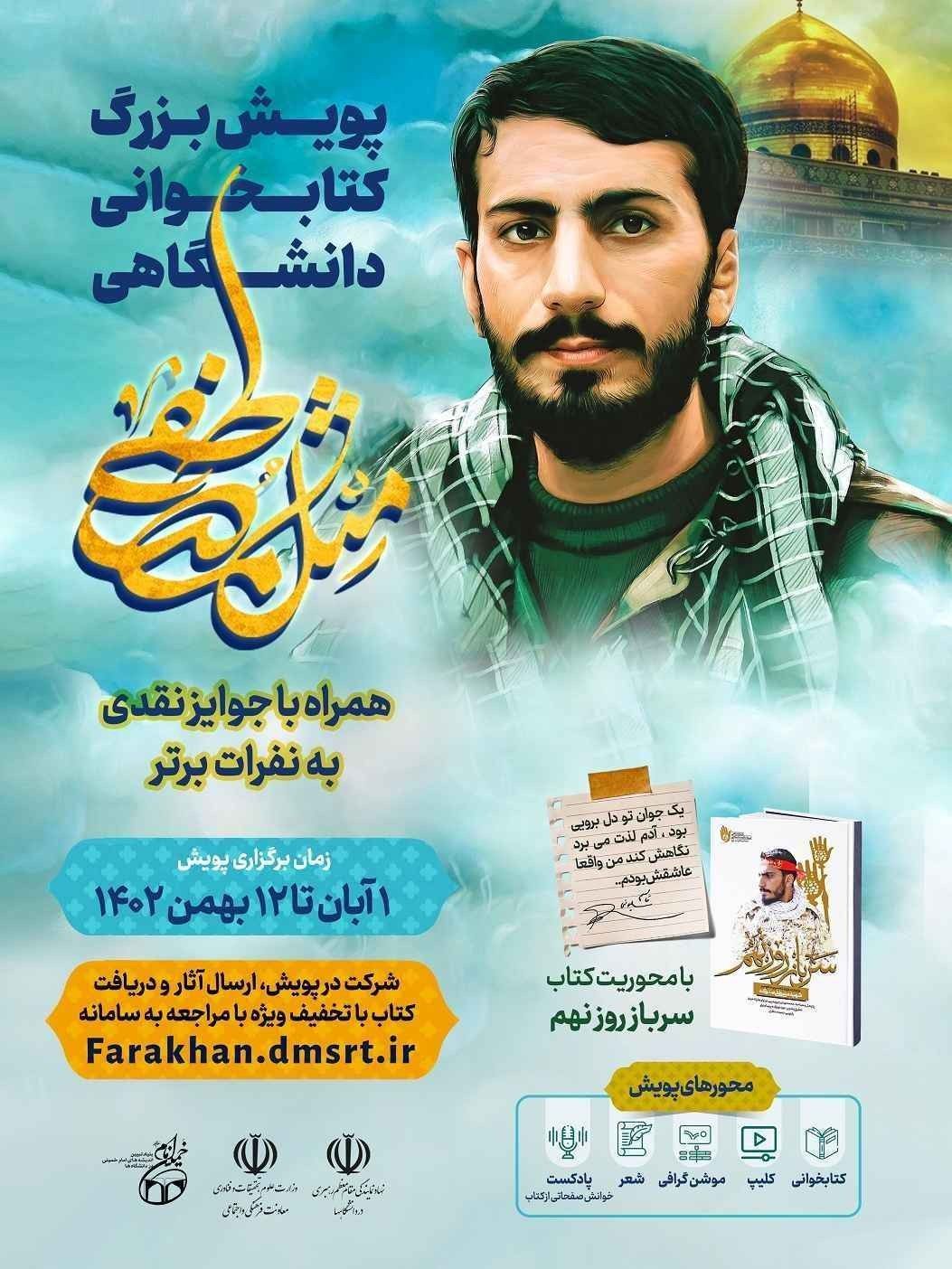480 پویش بزرگ کتابخوانی دانشگاهی «مثل مصطفی» پویش بزرگ کتابخوانی دانشگاهی (مثل مصطفی) همراه با جوایز نقدی به نفرات برتر از 1 آبان تا 12 بهمن 1402 با محوریت کتاب (سرباز روز نهم) در بخشهای...