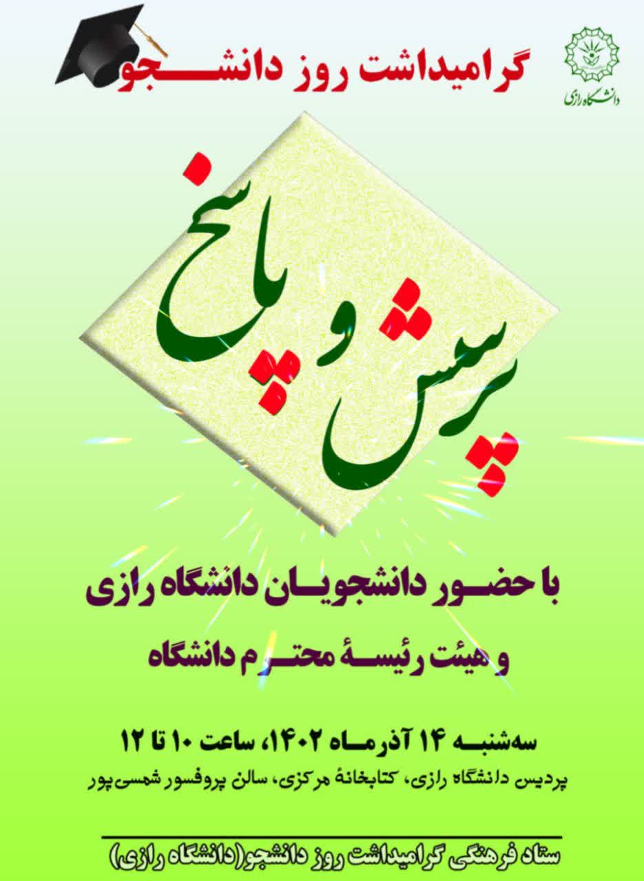 628 در آستانۀ روز دانشجو؛ جلسۀ پرسش و پاسخ دانشجویان با هیئت رئیسۀ دانشگاه جلسۀ پرسش و پاسخ دانشجویان دانشگاه رازی باحضور هیئت رئیسۀ محترم دانشگاه روز سهشنبه 14 آذرماه 1402 ساعت 10 تا 12 در...