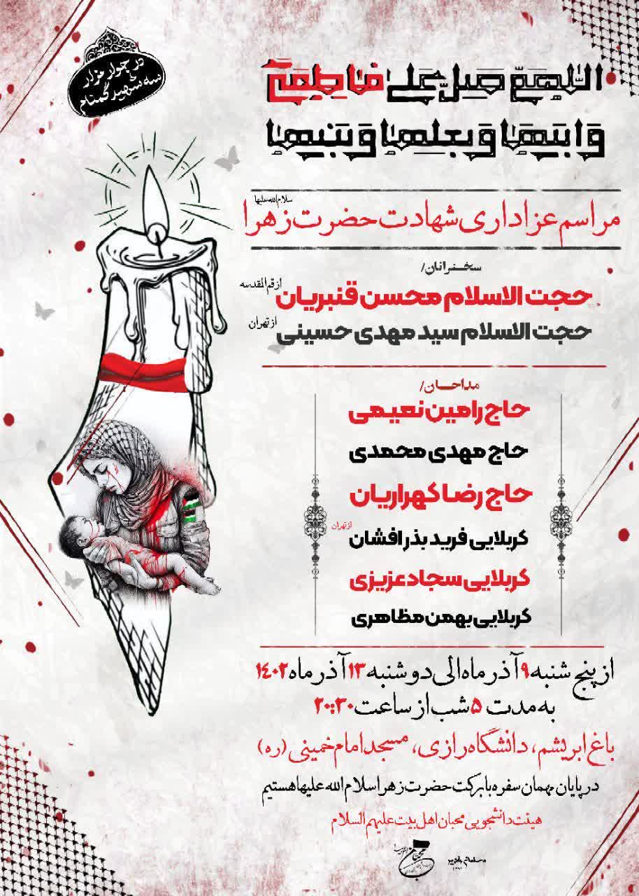 مراسم عزاداری شهادت حضرت فاطمهالزهرا سلام الله علیها با سخنرانی حجتالاسلام و المسلمین غفوری در دانشگاه رازی برگزار میشود.