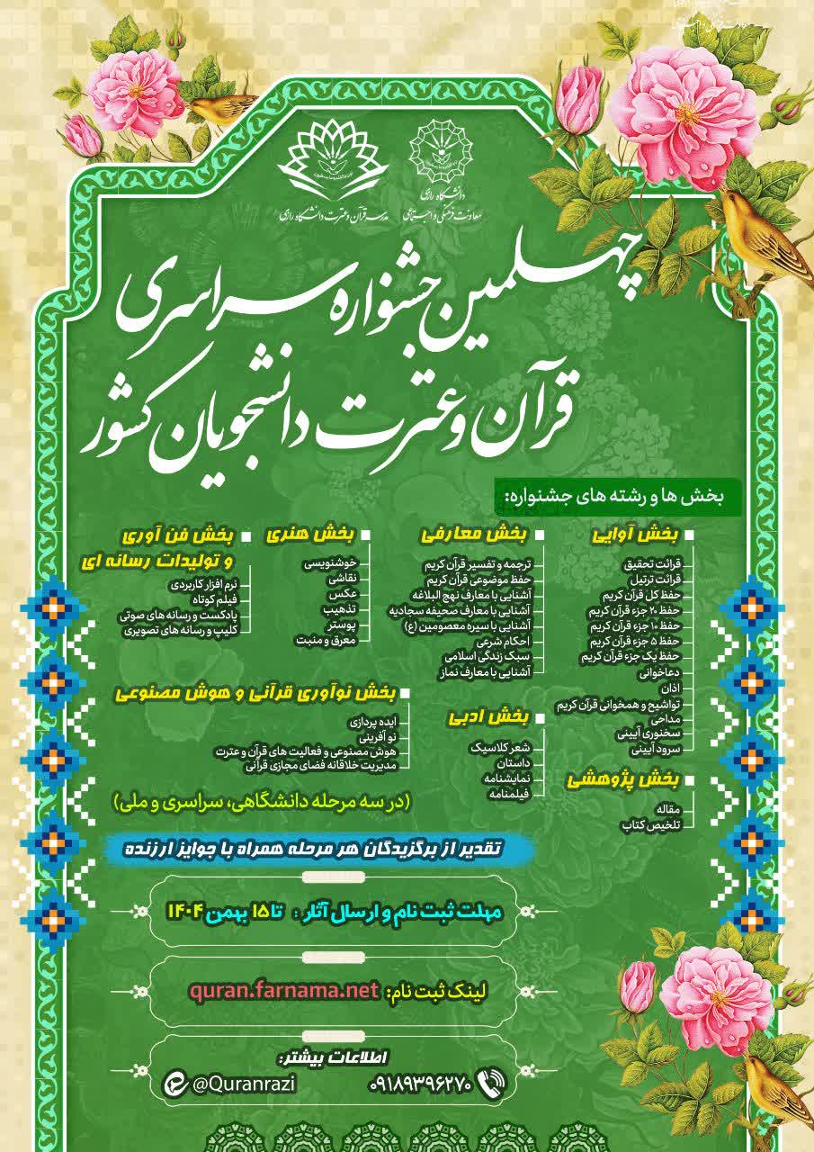 407 فراخوان چهلمین جشنوارهٔ سراسری قرآنوعترت دانشجویان کشور دعوت به فرصتی ناب و ارزشمند برای علاقمندان و شیفتگان قرآن کریم فراخوان چهلمین جشنوارهٔ سراسری قرآنوعترت دانشجویان کشور در 7...