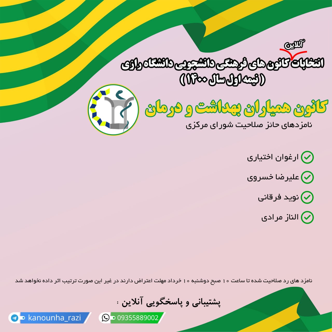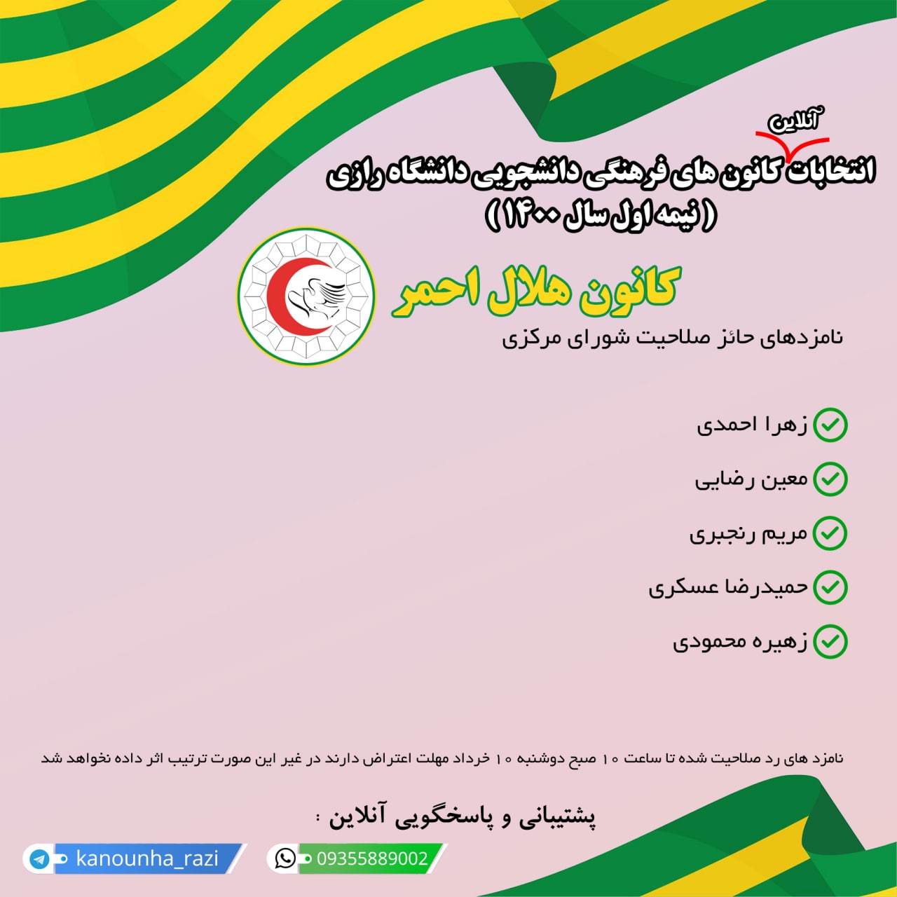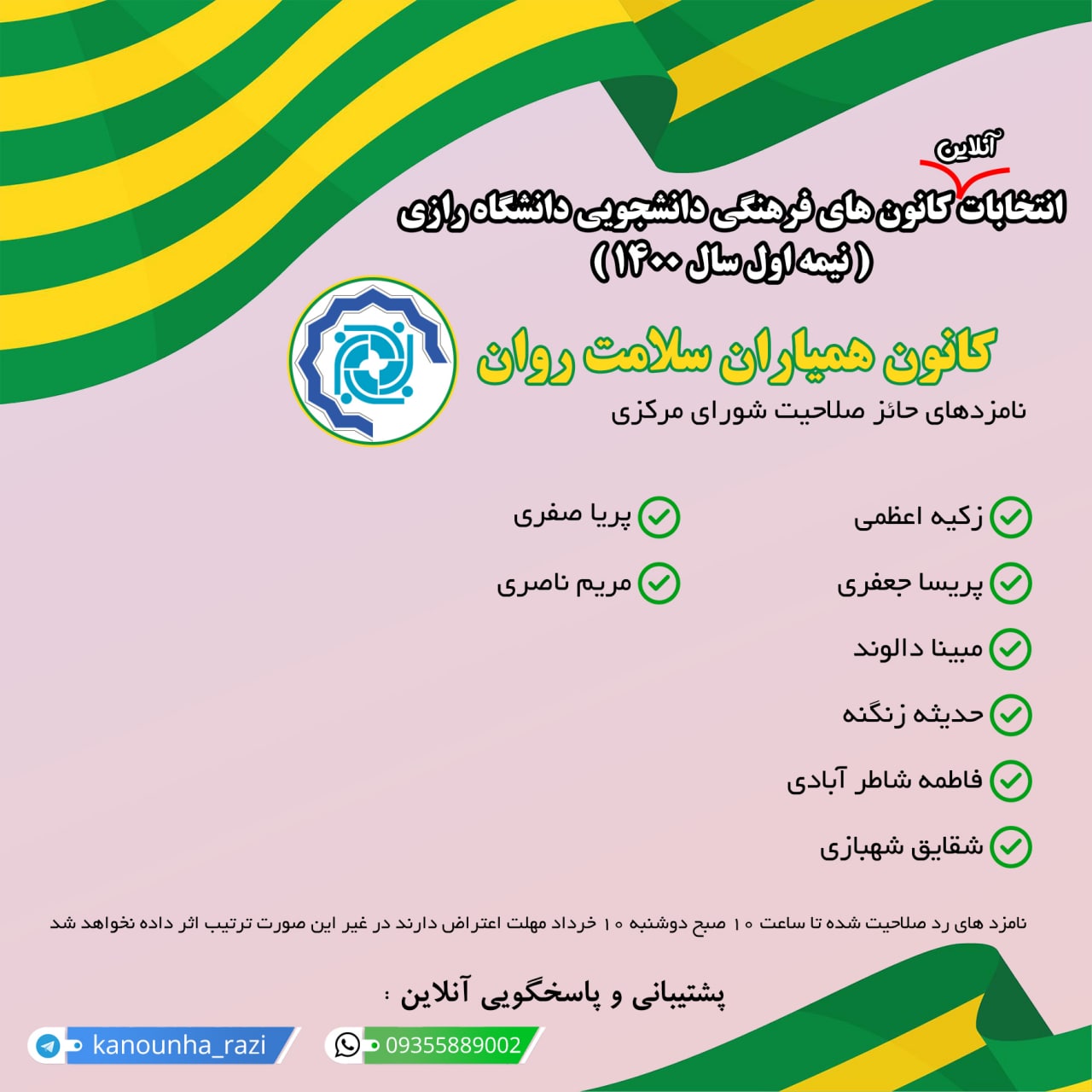 اسامی نامزدهای حائز صلاحیت شدۀ انتخابات شورای مرکزی کانونهای فرهنگی دانشگاه شامل: کانون خوشنویسی، کانون رادیو و رسانه، کانون شعر و ادب، کانون کارآفرینی، کانون هلال احمر، کانون همیاران بهداشت و درمان و کانون همیاران سلامت روان به شرح ذیل اعلام گردید.