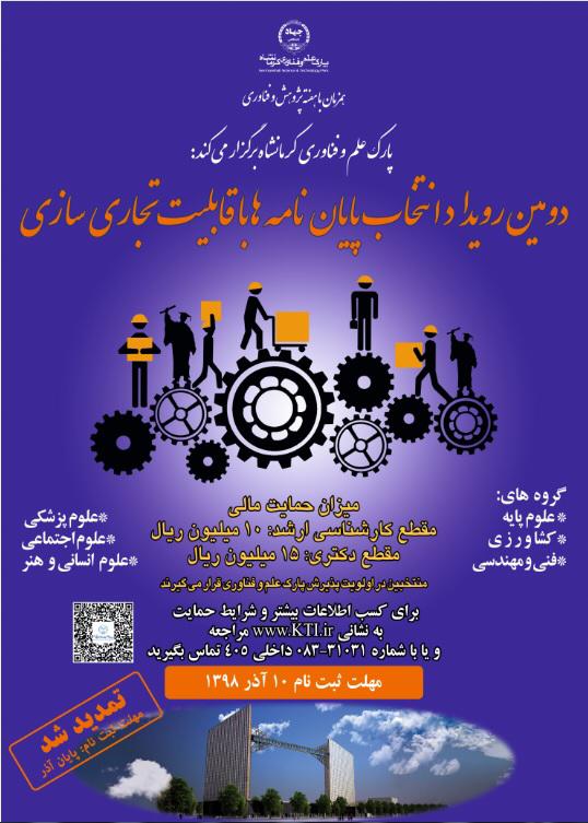 پارک علم و فناوری کرمانشاه همزمان با برگزاری هفته پژوهش و فناوری جهت بهره برداری مناسب از نتایج تحقیقات و پایان نامه های دانشجویان تحصیلات تکمیلی، برنامه ریزی و حمایت لازم به منظور جهت دهی مناسب موضوعات به طرح های دارای قابلیت تجاری سازی، رویدادی با عنوان «انتخاب پایان نامه ها با قابلیت تجاری سازی» برگزار می نماید.