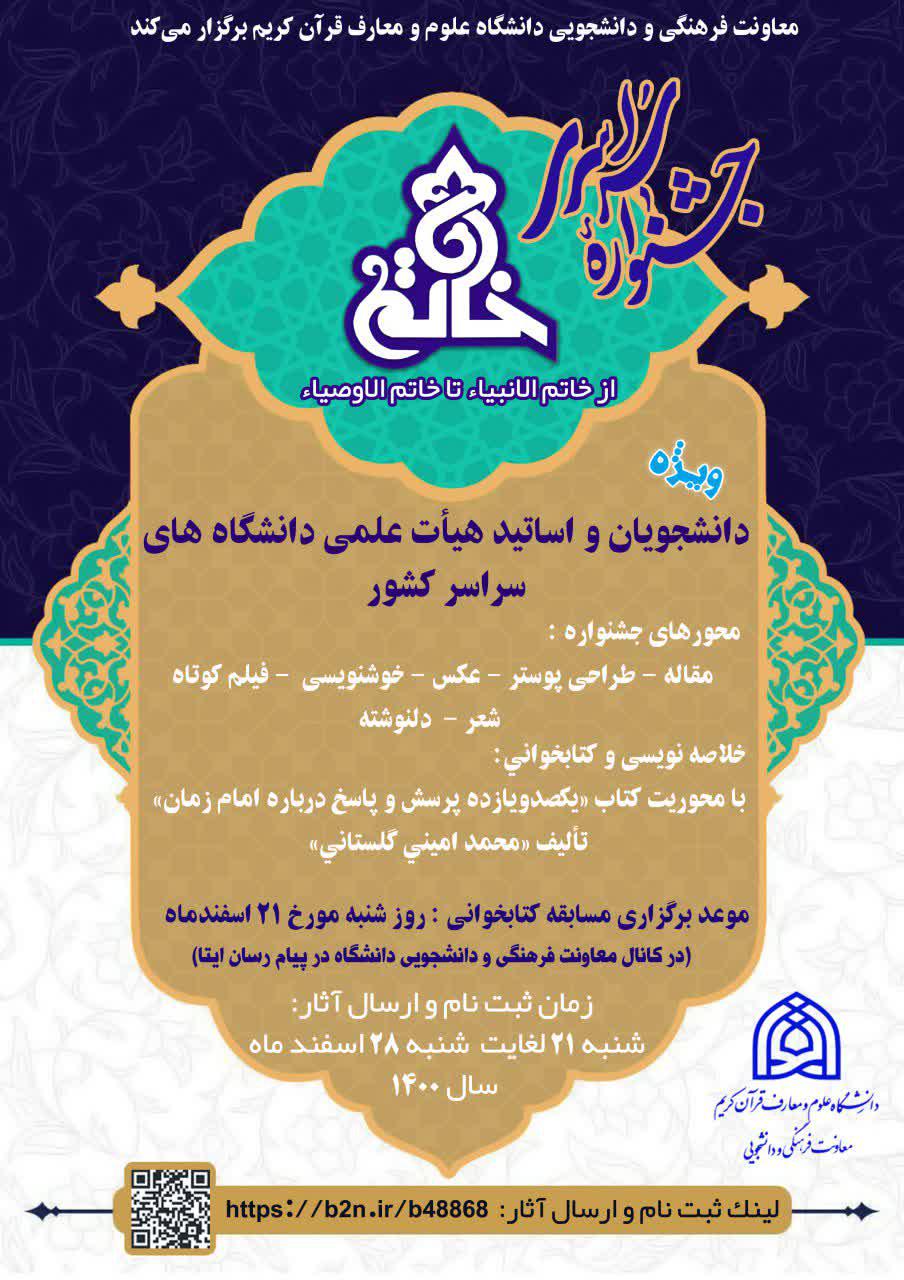 دانشـگاه علوم و معارف قرآنکریم «جشنوارۀ سراسري خاتم(خاتم الانبیاء تا خاتم الاوصیاء)» را در بخشهاي هنري، ادبی، پژوهشـی و مسابقه کتابخوانی، بهصورت مجازي برگزار مینماید.