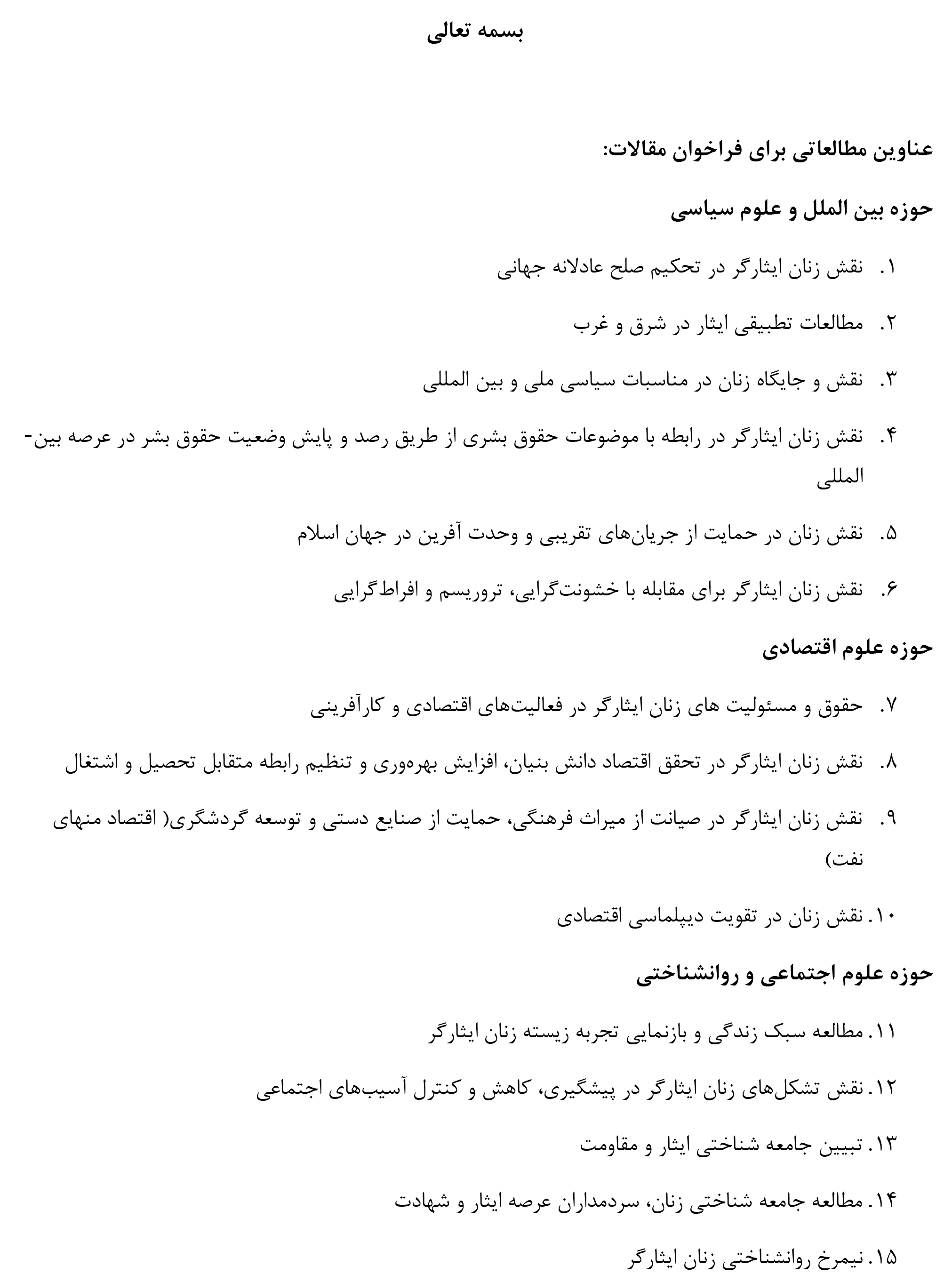 عناوین مطالعاتی برای ارسال مقالات به کنگره ملی بزرگداشت زنان شهید، جانباز و آزاده، در ۸ عنوان شامل حوزه های «فرهنگی و آموزشی»، «اجتماعی و روانشناختی»، «اقتصادی»، «سیاسی و بین المللی»، «حقوقی»، «دفاعی»، «رسانه و فضای مجازی» و «سلامت» می باشد.