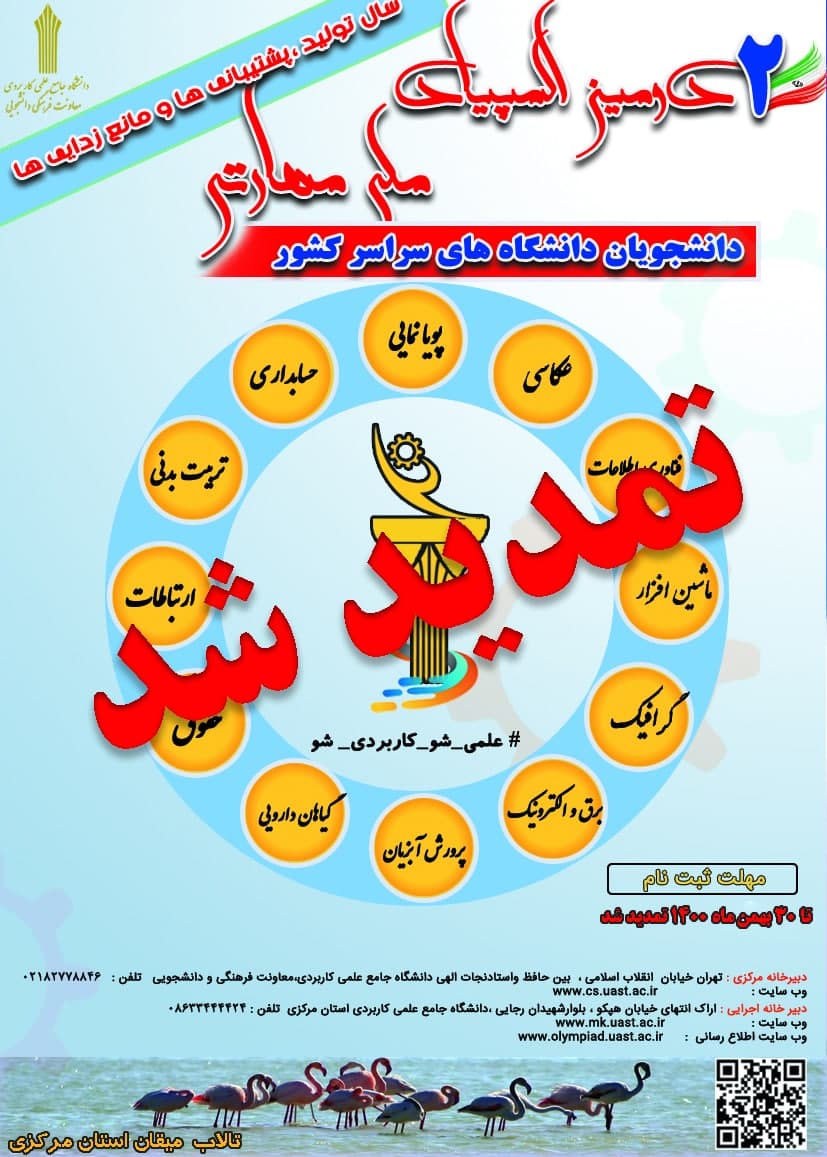 دومین المپیاد ملی مهارتی دانشجویان سراسر کشور در ۴ گروه آموزشی فنی، مهندسی و صنعت، کشاورزی و منابع طبیعی، علوم انسانی، مدیریت و خدمات اجتماعی و فرهنگ و هنر در ۱۲ رشته فناوری اطلاعات، ماشین افزار، برق و الکترونیک، گرافیک، پویانمایی، عکاسی، تربیت بدنی، حقوق، حسابداری، ارتباطات، گیاهان دارویی و پرورش آبزیان به میزبانی دانشگاه جامع علمی کاربردی واحد استانی مرکزی برگزار می شود.