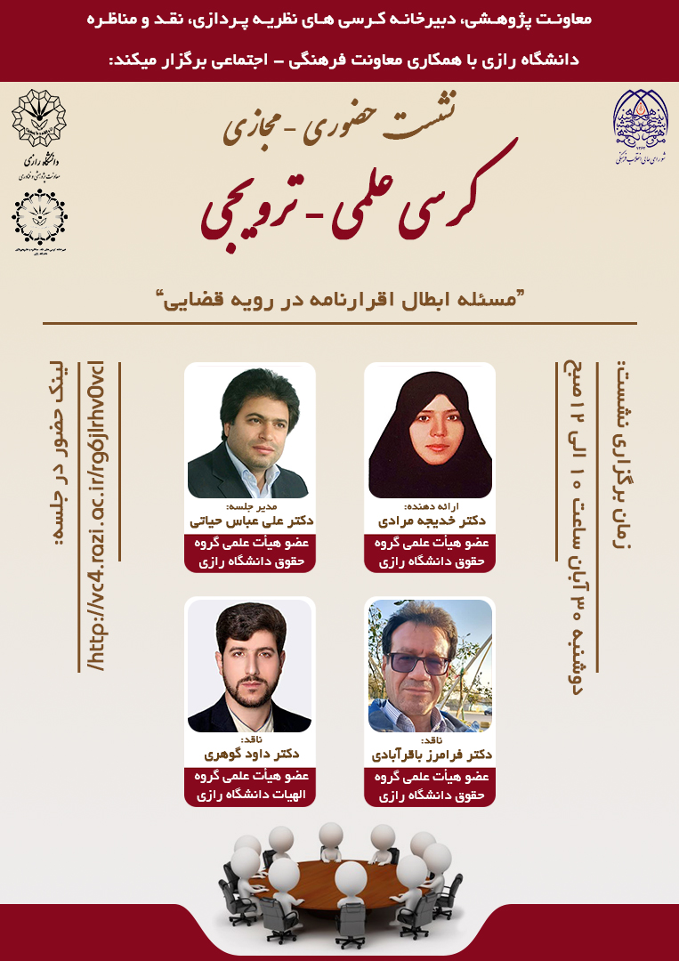 کرسی علمی – ترویجی با موضوع: «مسئله ابطال اقرارنامه در رویه قضایی» توسط معاونت پژوهشی، دبیرخانه کرسی‌های نظریه‌پردازی، نقد و مناظره دانشگاه رازی با همکاری معاونت فرهنگی - اجتماعی برگزار می‌شود.