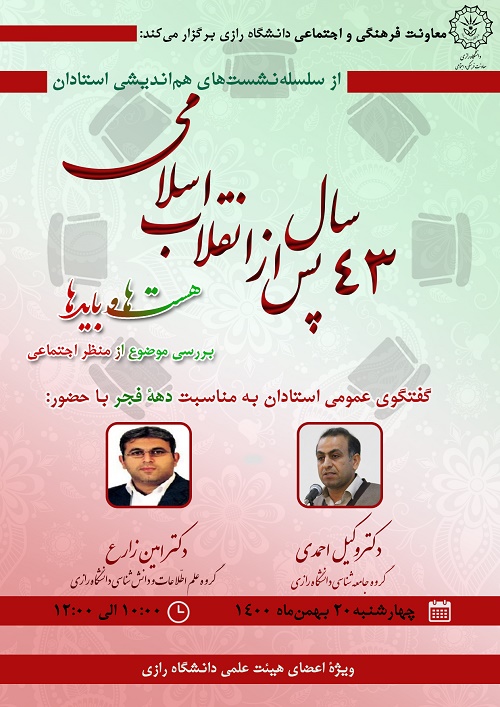 معاونت فرهنگی و اجتماعی دانشگاه رازی، گفتگوی عمومی استادان دانشگاه رازی را به مناسبت سالگرد پیروزی انقلاب اسلامی با عنوان «چهلوسه سال پس از انقلاب اسلامی؛ هستها و بایدها» (بررسی موضوع از زاویۀ اجتماعی) با حضور دکتر وکیل احمدی (گروه جامعهشناسی) و دکتر امین زارع (گروه علم اطلاعات و دانش شناسی) برگزار مینماید.
