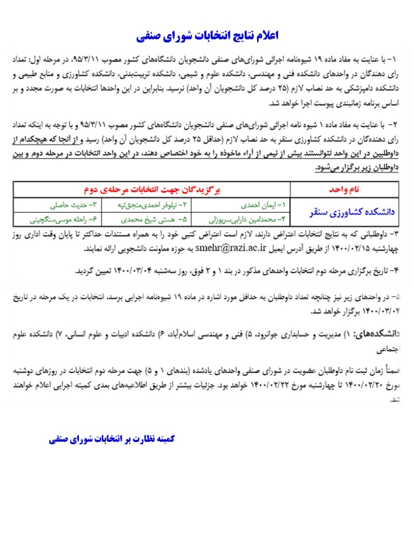 اعلام نتایج انتخابات شورای صنفی - دانشکده کشاورزی سنقر