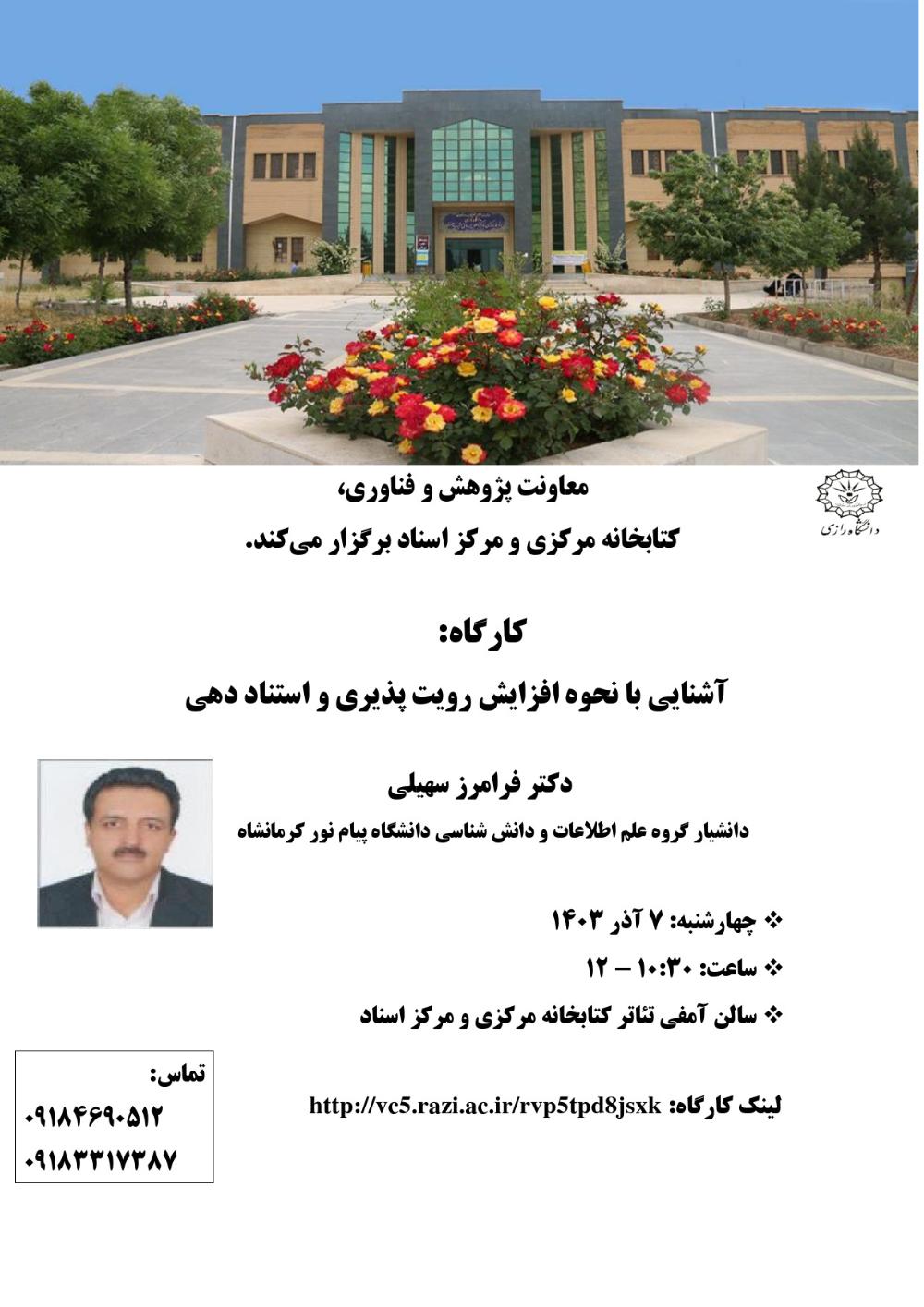 4793 کارگاه آشنایی با نحوه افزایش رویت پذیری و استناددهی برگزاری کارگاه آشنایی با نحوه افزایش رویت پذیری و استناددهی توسط آقای دکتر فرامرز سهیلی در روز چهارشنبه 7 آذر 1403 ساعت 10:30-12 در سالن...
