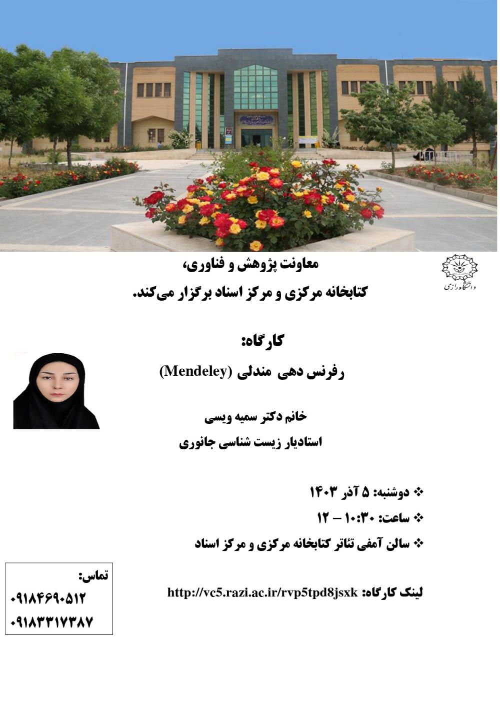 9626 کارگاه آموزشی رفرنس دهی مندلی (Mendeley) برگزاری کارگاه رفرنس دهی مندلی (Mendeley) توسط خانم دکتر سمیه ویسی در روز دوشنبه 5 آذر 1403 ساعت 10:30-12 در سالن آمفی تئاتر کتابخانه مرکزی و مرکز...