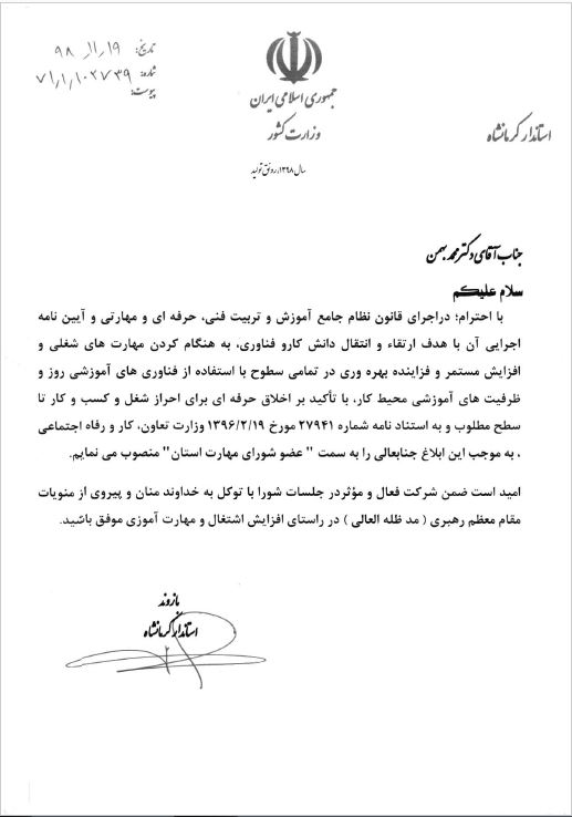 انتصاب دکتر بهمن به عنوان عضو شورای مهارت استان کرمانشاه و راهبر ایجاد اقتصاد دانش بنیان استان
