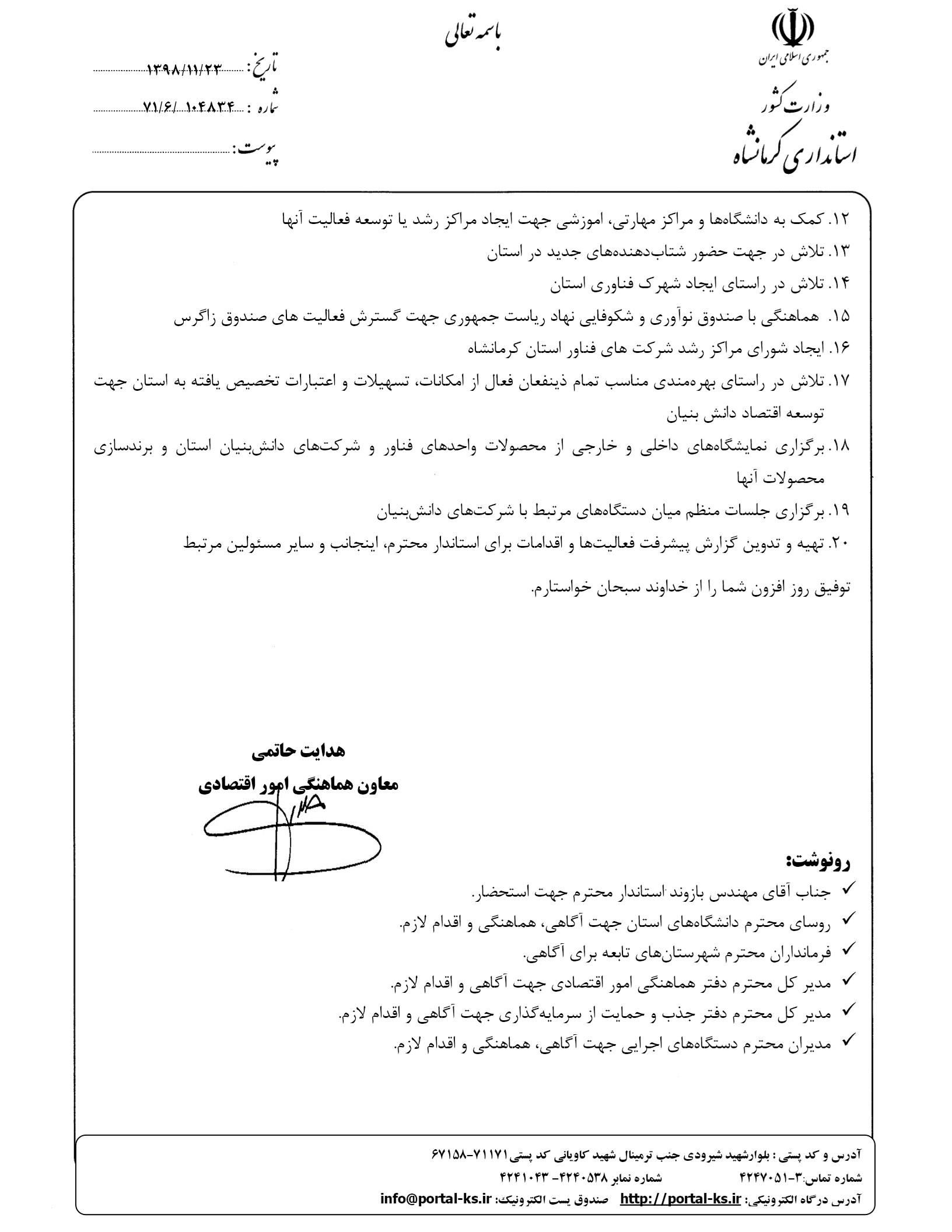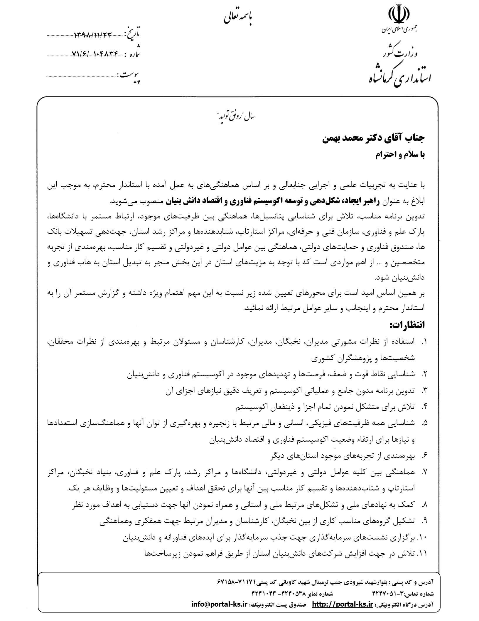 همچنین دکتر هدایت حاتمی معاون هماهنگی امور اقتصادی استانداری کرمانشاه طی صدور حکمی دکتر محمد بهمن را به سمت راهبر ایجاد، شکلدهی و توسعه اکوسیستم فناوری و اقتصاد دانش بنیان استان کرمانشاه منصوب کرد.