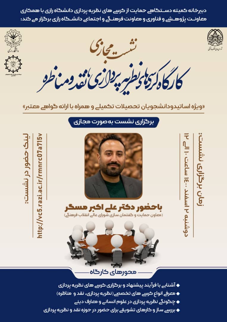 نشست مجازی تحت عنوان : کارگاه کرسی های نظریه پردازی، نقد و مناظره" ویژه اساتید و دانشجویان تحصیلات تکمیلی ، باحضور دکتر علی اکبر مسگر در تاریخ دوشنبه 2 اسفند برگزار می شود.