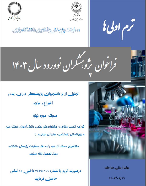 نظر به تجلیل از پژوهشگران و فناوران برگزیده دانشگاه در هفته پژوهش و فناوری سال جاری، به استحضار میرساند این معاونت در نظر دارد از میان دانشجویان نوورود که دارای سوابق پژوهشی و فناوری در دوران دانشآموزی طبق شرایط ذیل میباشند؛ پژوهشگر و فناور برگزیده انتخاب نماید:
