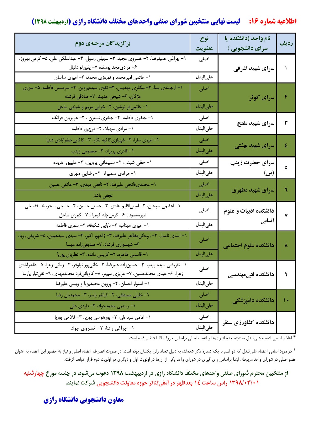 لیست نهایی منتخبین شورای صنفی واحد های مختلف دانشگاه رازی - معاونت دانشجویی