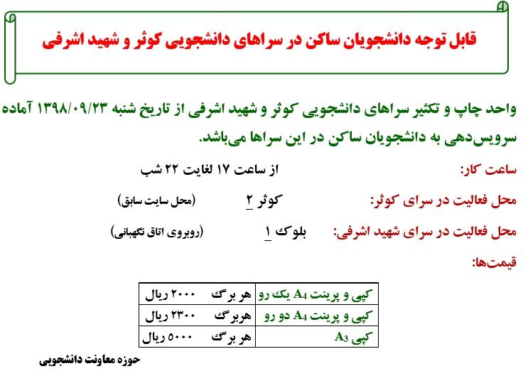 واحد چاپ و تکثیر در سراهای دانشجویی کوثر و شهید اشرفی