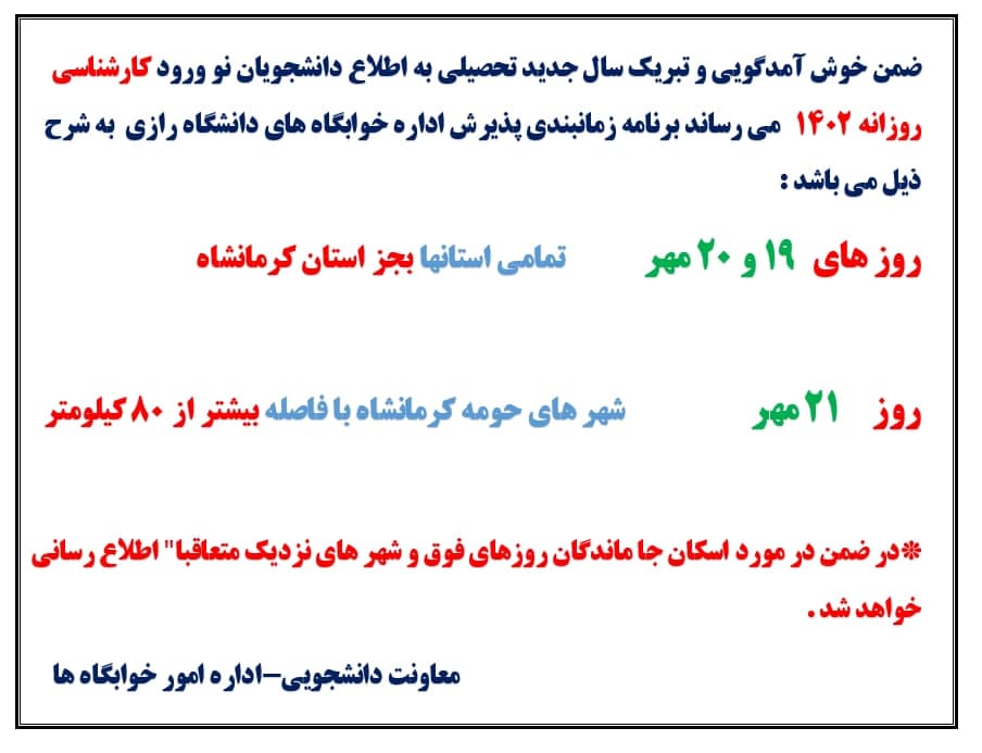 اطلاعیه زمانبندی و نحوه پذیرش اداره خوابگاه ها -دانشجویان کارشناسی ورودی 1402 - معاونت دانشجویی