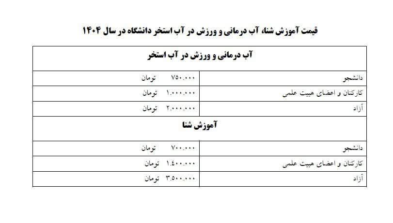 نرخ جدیداآموزش شنا، ورزش در آب و آب درمانی در سال1404 - معاونت دانشجویی