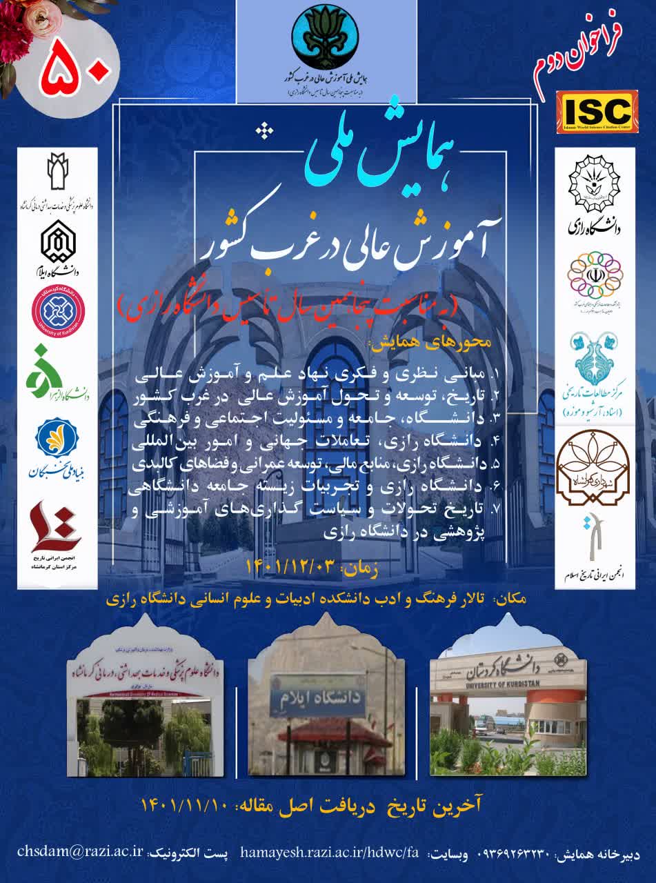 1567 فراخوان دوم ارسال مقالات، یادداشت و... به همایش ملی « آموزش عالی در غرب کشور (به مناسبت پنجاهمین سالگرد تاسیس دانشگاه رازی)» فراخوان دوم ارسال مقالات، یادداشت و... به همایش ملی « آموزش...