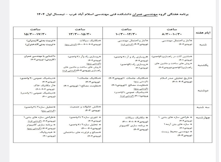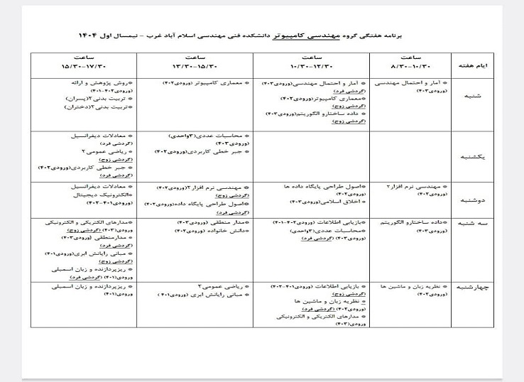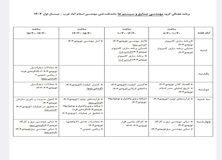 برنامه هفتگی نیمسال اول سال تحصیلی 05-1404 - دانشکده فنی و مهندسی اسلام آباد غرب