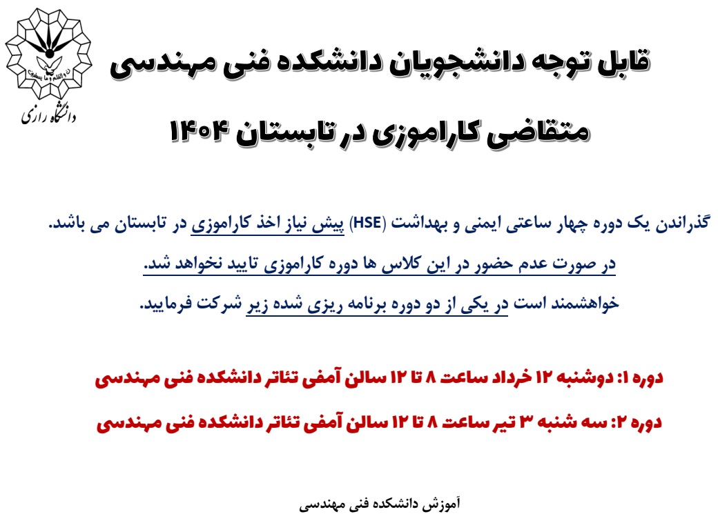 قابل توجه دانشجویان دانشکده فنی مهندسی متقاضی کاراموزی در تابستان 1404
