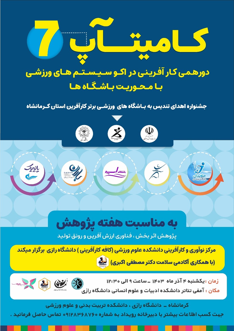 هفتمین رویداد ورزشی کامیتآپ (دورهمی کارآفرینی در اکوسیستم‌های ورزشی با محوریت باشگاه‌ها) به میزبانی دانشکده علوم ورزشی دانشگاه رازی