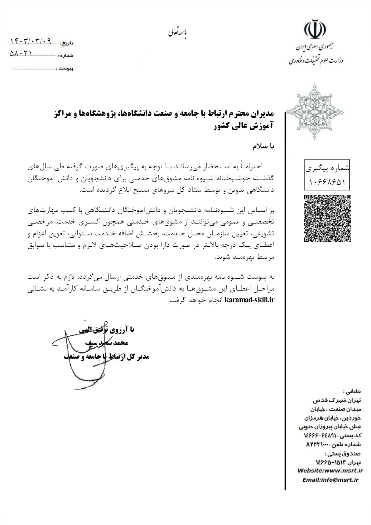 ابلاغ مشوق های خدمتی ویژه دانشجویان - گروه کارآفرینی و ارتباط با صنعت