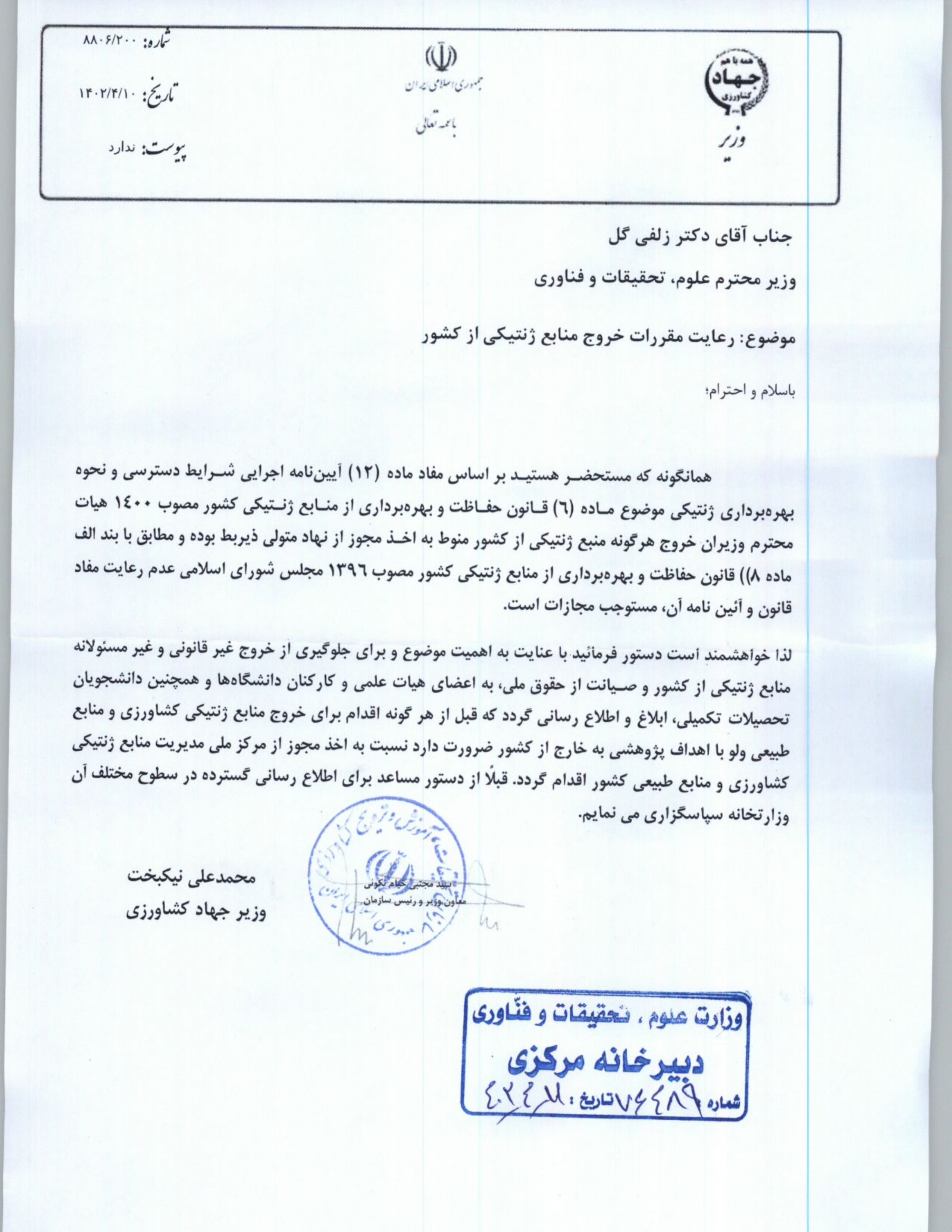 بخشنامه در خصوص رعایت مقررات خروج منابع ژنتیکی از کشور