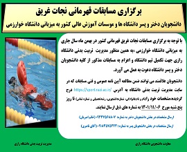 712 مسابقات قهرمانی کشور در رشته نجات غریق مسابقات قهرمانی کشور نجات غریق دانشجویان (دختر و پسر) دانشگاه ها و موسسات آموزش عالی کشور به میزبانی دانشگاه خوارزمی لینک آیین نامه مسابقات Copy to...