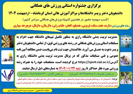 1176 مدیریت تربیت بدنی دانشگاه رازی برگزار نمود: مسابقات تنیس روی میز کارکنان و اعضای هیات علمی به مناسبت گرامیداشت دهه مبارک فجر - 1403 مدیریت تربیت بدنی دانشگاه در راستای اجرای برنامههای...