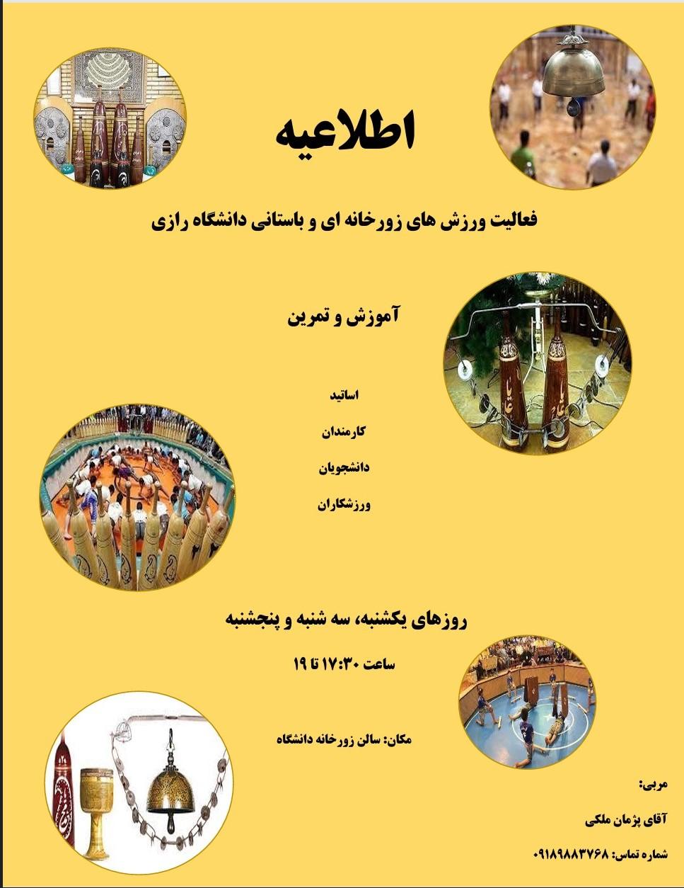 214 مدیریت تربیت بدنی برگزار می کند آموزش و تمرين ورزش هاى زورخانه اى و باستانى آموزش و تمرين ورزش هاى زورخانه اى و باستانى ويژه اساتيد، كارمندان، دانشجويان و ورزشكاران روزهاى فرد ساعت ١٧:٣٠ تا ١٩...