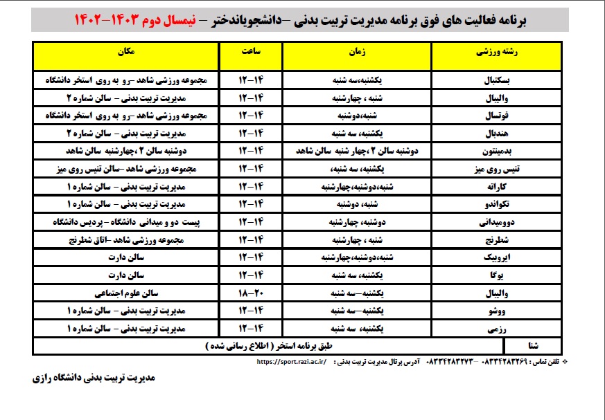 برنامه فعالیت های فوق برنامه دانشجویان دختر و پسر دانشگاه رازی- نیمسال دوم 1403-1402 - مدیریت تربیت بدنی