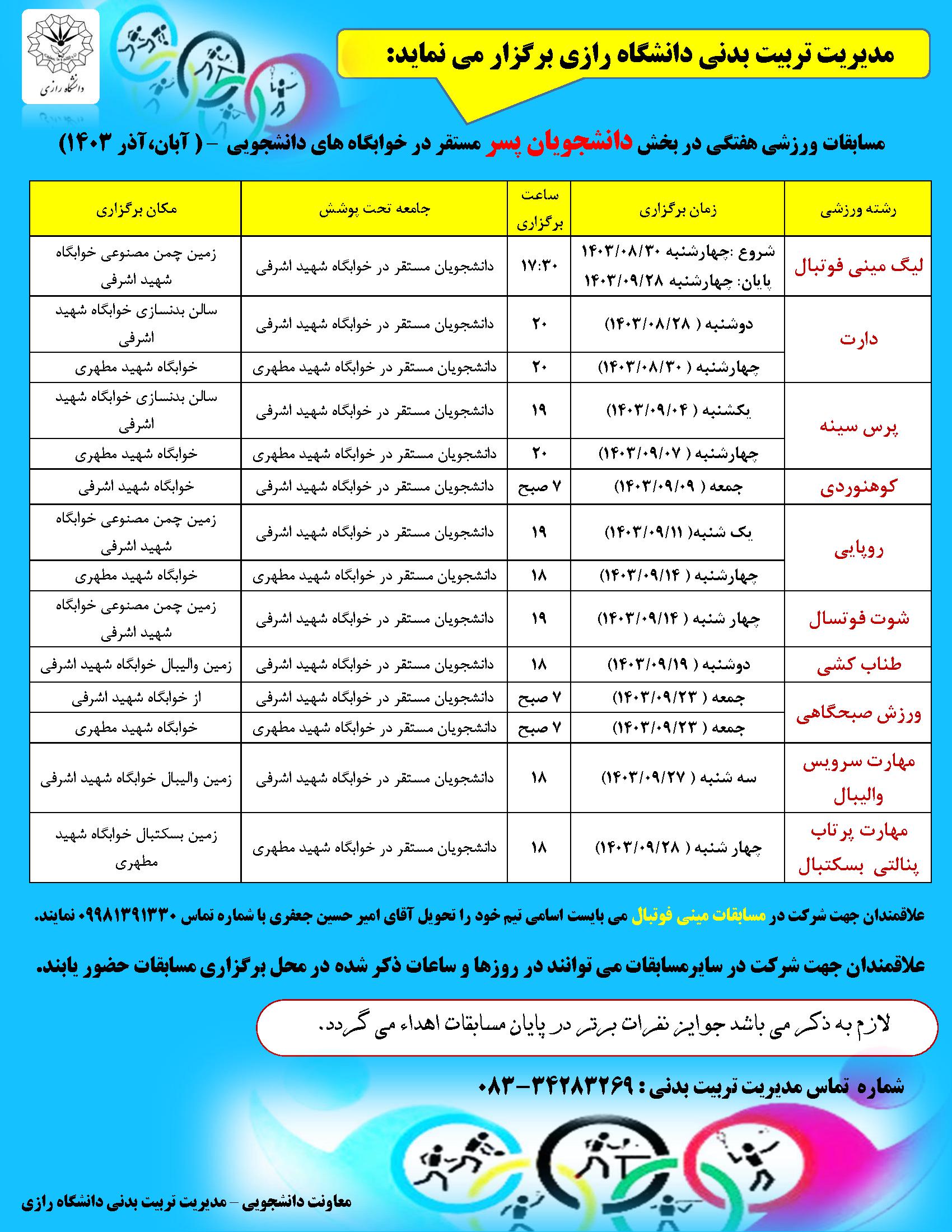 مدیریت تربیت بدنی دانشگاه رازی برگزار می نماید:
